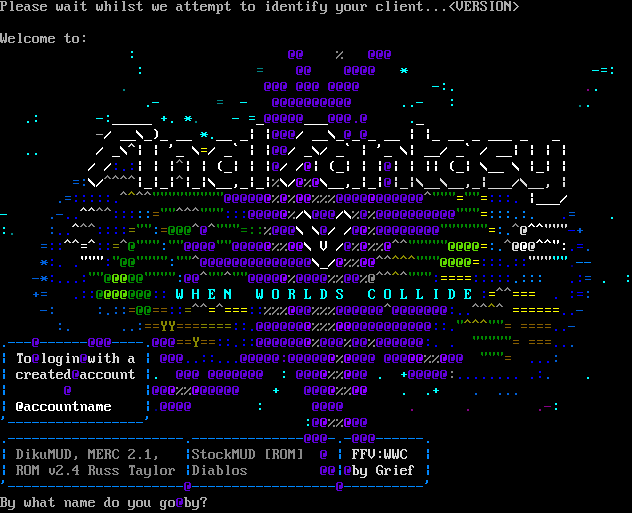 Please wait whilst we attempt to identify your client...<VERSION> Welcome to: : @@ % @@@ : = @@ @@@@ \* -=: . @@@ @@@ @@@@ -:. .. .- = - @@@@@@@@@@ ..- : .. .: -:_​____ +. \*. - =_@@@@@___@@@.@ ._ -/ __\\_)_ __ \*.__ _\| \|@@@/ __\\_@_@_ __ \| \|_ __ _ ___ _ _ .. / _\\^\| \| '_ \\=/ _\` \| \|@@/ _\\/ _\` \| '_ \\\| __/ _\` / __\| \| \| \| / /:.:\| \| \|^\| \| (_\| \| \|@/ /@\| (_\| \| \|@\| \| \|\| (_\| \\__ \\ \|_\| \| =:\\/^​^^^\|_\|_\|^\|_\|\\__,_\|_\|%\\/@%@\\__,_\|_\|@\|_\|\\__\\__,_\|___/\\__, \| .=:::::.​^^^^"""""""""@@@@@@%@%@@%%%@@@@@@@@@@@^​"""=""=:::. \|___/ - .​-..^^^^:::::=​""^^^""":::@@@@@%/\\@@@/\\%@%@@@@@@@@@@"​""=:::.:. .= . :. :.​.^^^::::="":=@@@^@^​"""=::%@@@\\ \\@/ /@@%@@@@@@@@"​"""""=:.^@^​^"""-+ =::^​^=^::=^@""":""@@@@""@@@@@%%@@\\ V /@%@%%@^​^"""""@@@@=:.^@@@^^":.=. \*:. .​""":"@@"​""":""^@@@@@@@@@@@@@@\\_/@%%@@^​^^^^"""@@@@=:::.::"​"""".-- -\*:...:""@@@@@"​""":@@^​""^""@@@@@%@@@@%%@@%@^​^^^""":=​===:::::.::: .:= . : += .::@@@@@@@:: W H E N W O R L D S C O L L I D E :=​^^=== . :=: -: :.::=@@==::=​^^=^===::%%%@@@%%%@@@@@@^@@@@@@@:.​.^^^^ =​=====..- :. ..:==YY=​======::.@@@@@@@%%%@@@@@@@@@@@@::.​"^^^""= =​===..- .​---@-​-----@@@-​---.@@@==Y==::.::@@@@@@@%@@@%@@%@@@@@@:. . "​""""= =​==... \| To@login@with a \| @@@..::...@@@@@:@@@@@@%@@@@ @@@@@%%@@@ "​""= ...: \| created@account \|. @@@ @@@@@@@ : @@@@%%@@@ . +@@@@@:.​....... .:. . \| @ \|@@@%%@@@@@@ + @@@@%%@@ . .+ . ... \| @accountname \|.@@@@ : @@@@ . . .-: '-​----------------' :@@%%@@@ .​----------------------.--------------@@@-.-@@@-​-----. \| DikuMUD, MERC 2.1, \|StockMUD [ROM] @ \| FFV:WWC \| \| ROM v2.4 Russ Taylor \|Diablos @@\|@by Grief \| '-​---------------------@-​-----------------@-​---------' By what name do you go@by?