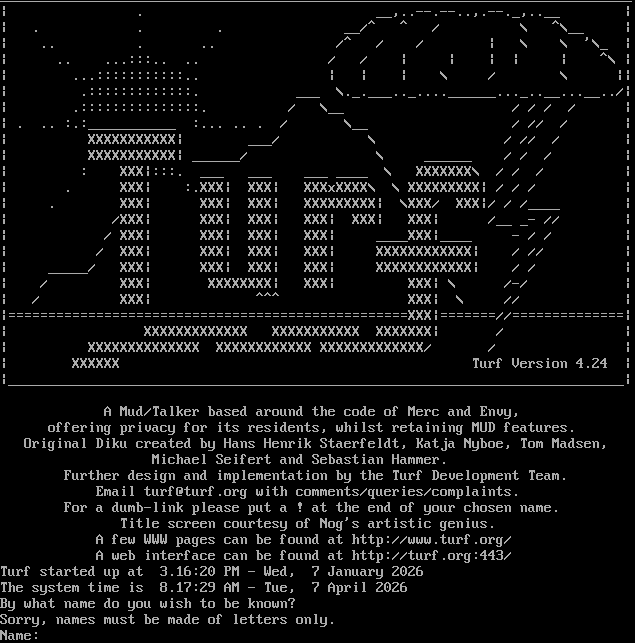 <!-_​______________________________________________________________________________ \| . __,.​.--.--..,.​--._,.​.__ \| \| . . . __/^ ^ / \\ ^\\__ \| \| .. . .. /^ / / \| \\ \\ '\\_ \| \| .. ...:::.. .. / / \| \| \| \| \| ^\\ \| \| ...:::::::::::.. \| \| \| \\ / \\ \|\| \| .:::::::::::::. ___ \\.​_.___.._....______..._..__...__../\| \| .:::::::::::::::. / \\__ / / / / \| \| . .. :.:_​__________ :... .. . / \\__ / // / \| \| XXXXXXXXXXX\| ___/ \\ / // / \| \| XXXXXXXXXXX\| _​_____/ \\ _​_____ / / / \| \| : XXX\|:::. ___ ___ ___ _​___ \\ XXXXXXX\\ / / / \| \| . XXX\| :.XXX\| XXX\| XXXxXXXX\\ \\ XXXXXXXXX\| / / / \| \| . XXX\| XXX\| XXX\| XXXXXXXXX\| \\XXX/ XXX\|/ / /_​___ \| \| /XXX\| XXX\| XXX\| XXX\| XXX\| XXX\| /__ _- // \| \| / XXX\| XXX\| XXX\| XXX\| _​___XXX\|_​___ - / / \| \| / XXX\| XXX\| XXX\| XXX\| XXXXXXXXXXXX\| / // \| \| _​____/ XXX\| XXX\| XXX\| XXX\| XXXXXXXXXXXX\| / / \| \| / XXX\| XXXXXXXX\| XXX\| XXX\| \\ /-/ \| \| / XXX\| ^^^ XXX\| \\ // \| \|=​=================================================XXX\|=​======//=​=============\| \| XXXXXXXXXXXXX XXXXXXXXXXX XXXXXXX\| / \| \| XXXXXXXXXXXXXX XXXXXXXXXXXX XXXXXXXXXXXXX/ / \| \| XXXXXX Turf Version 4.24 \| \|_​____________________________________________________________________________\| A Mud/Talker based around the code of Merc and Envy, offering privacy for its residents, whilst retaining MUD features. Original Diku created by Hans Henrik Staerfeldt, Katja Nyboe, Tom Madsen, Michael Seifert and Sebastian Hammer. Further design and implementation by the Turf Development Team. Email turf@turf.org with comments/queries/complaints. For a dumb-link please put a ! at the end of your chosen name. Title screen courtesy of Nog's artistic genius. A few WWW pages can be found at http://www.turf.org/ A web interface can be found at http://turf.org:443/ Turf started up at 3.16:20 PM - Wed, 7 January 2026 The system time is 8.17:29 AM - Tue, 7 April 2026 By what name do you wish to be known? Sorry, names must be made of letters only. Name: