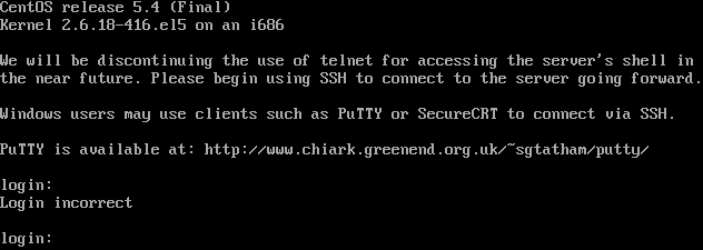 CentOS release 5.4 (Final) Kernel 2.6.18-416.el5 on an i686 We will be discontinuing the use of telnet for accessing the server's shell in the near future. Please begin using SSH to connect to the server going forward. Windows users may use clients such as PuTTY or SecureCRT to connect via SSH. PuTTY is available at: http://www.chiark.greenend.org.uk/~sgtatham/putty/ login: Login incorrect login: