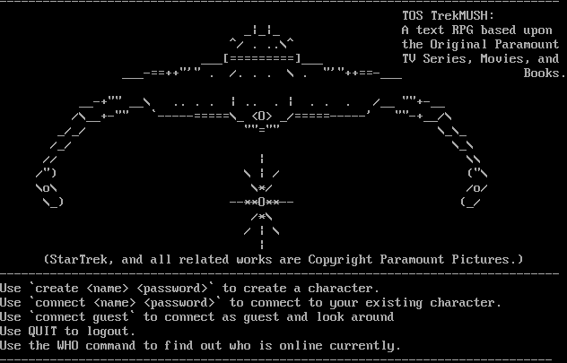 -​----------------------------------------------------------------------------- TOS TrekMUSH: _\|_\|_ A text RPG based upon ^/ . ..\\^ the Original Paramount ___[=​========]___ TV Series, Movies, and _​__-==++"'" . /. . . \\ . "'"​++==-___ Books. _​_-+"" __\\ .. . . \| .. . \| . . . /__ "​"+-__ /\\_​_+-"" \`-​----=====\\_ <O> _/=​====-----' "​"-+__/\\ _/_/ "​"="" \\_\\_ /_/ \\_\\ // \| \\\\ /") \\ \| / ("\\ \\o\\ \\\*/ /o/ \\_) --\*\*O\*\*-- (_/ /\*\\ / \| \\ \| (StarTrek, and all related works are Copyright Paramount Pictures.) -​----------------------------------------------------------------------------- Use \`create <name> <password>\` to create a character. Use \`connect <name> <password>\` to connect to your existing character. Use \`connect guest\` to connect as guest and look around Use QUIT to logout. Use the WHO command to find out who is online currently. -​----------------------------------------------------------------------------