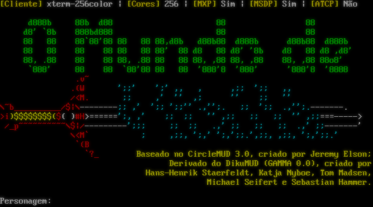 Tentando identificar o cliente. Aguarde... [Cliente] xterm-256color \| [Cores] 256 \| [MXP] Sim \| [MSDP] Sim \| [ATCP] Não d888b 88b d88 88 88 d8' \`8b 888bd888 88 88 88 88 88\`88'88 88 88 88,d8b d88b88 d888b d88b88 d888b 88 88 88 88 88 88 88' 88 d8 88 d8' '8b d8 88 d8 ,d8' 88, .88 88 88 88, .88 88 88 88, ,88 88, ,88 88, ,88 88o8' \`888' 88 88 \`88'88 88 88 '888'8 '888' '888'8 '8888 .v~ .(W ';;' ';' ,, , ,;; ';; ,, /<M. ;; ,' '' ,; '' ;; '' \\~b_​_________/$\|\\-​-------;; ,' ';; ';;'' .,'';. ;; ';; .,'';.​-------. >i)$$$$$$$$($( )#H>=​=====';, ,' ;; ;; '' ,;; ;; ;; '' ,;;=​==-----> /_p~​~~~~~~~~~\\$\|/-​--------';;; ;; ;; .,' ;; ;; ;; .,' ;;-​------' \\<M\` ; ,;;, ';,' ';,';;.',;;, ,;;, ';,';;.' \`(B \`?_ Baseado no CircleMUD 3.0, criado por Jeremy Elson; Derivado do DikuMUD (GAMMA 0.0), criado por Hans-Henrik Staerfeldt, Katja Nyboe, Tom Madsen, Michael Seifert e Sebastian Hammer. Personagem: