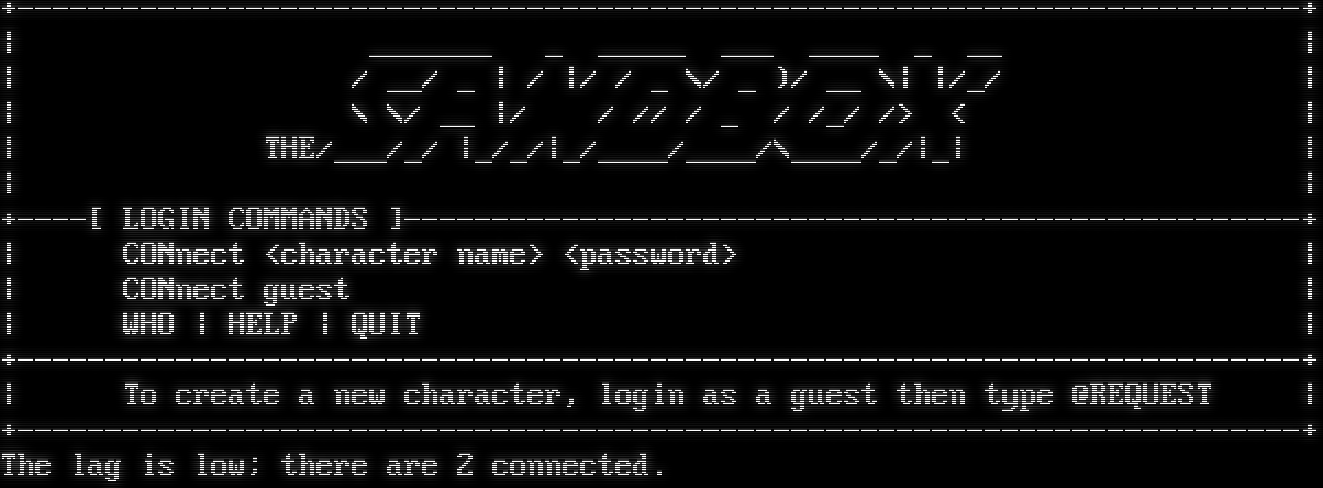 +​-------------------------------------------------------------------------+ \| _​______ _ _​____ ___ _​___ _ __ \| \| / __/ _ \| / \|/ / _ \\/ _ )/ __ \\\| \|/_/ \| \| \\ \\/ __ \|/ / // / _ / /_/ /> < \| \| THE/___/_/ \|_/_/\|_/_​___/_​___/\\_​___/_/\|_\| \| \| \| +​----[ LOGIN COMMANDS ]-​--------------------------------------------------+ \| CONnect <character name> <password> \| \| CONnect guest \| \| WHO \| HELP \| QUIT \| +​-------------------------------------------------------------------------+ \| To create a new character, login as a guest then type @REQUEST \| +​-------------------------------------------------------------------------+ The lag is low; there are 2 connected.