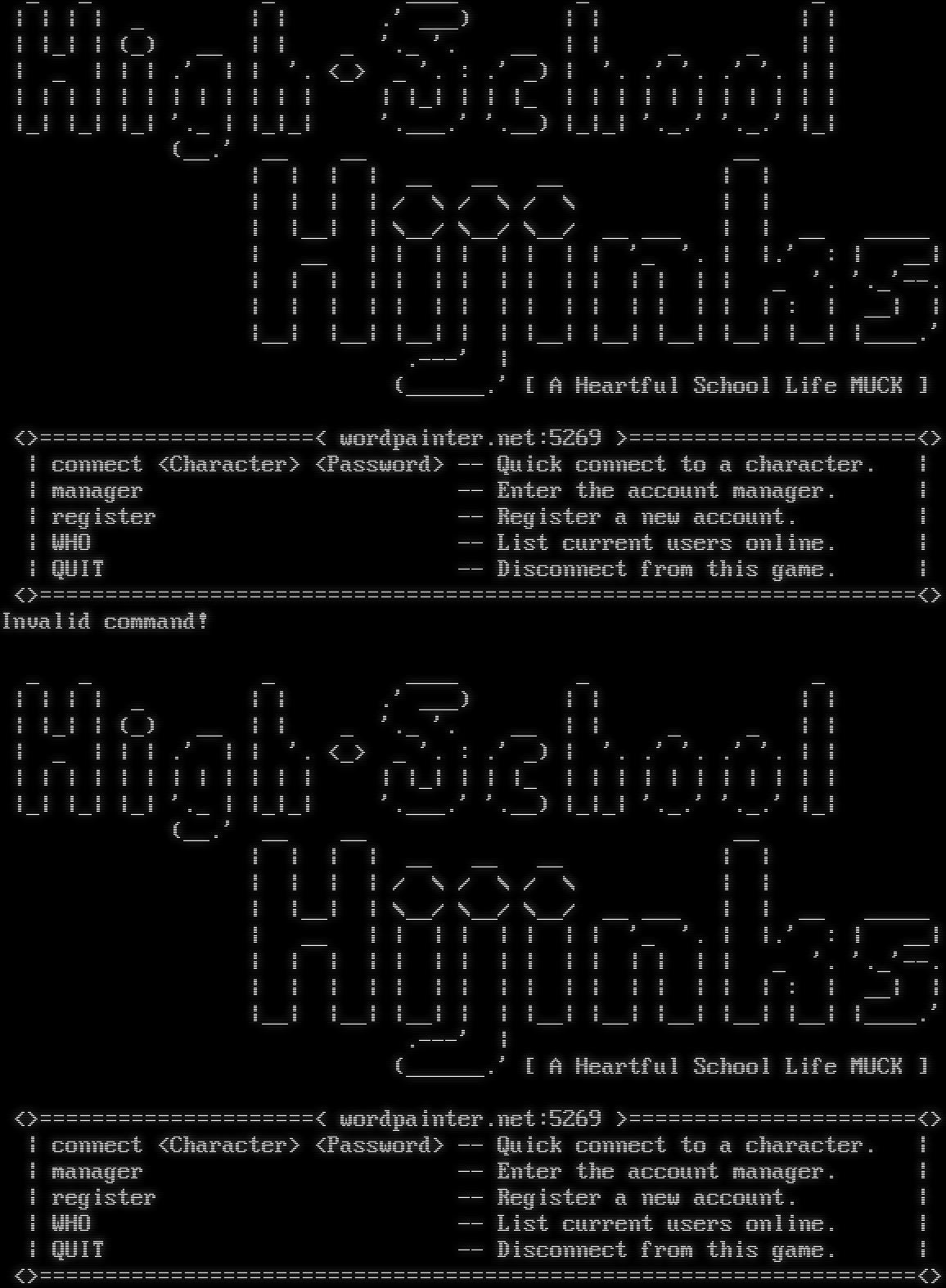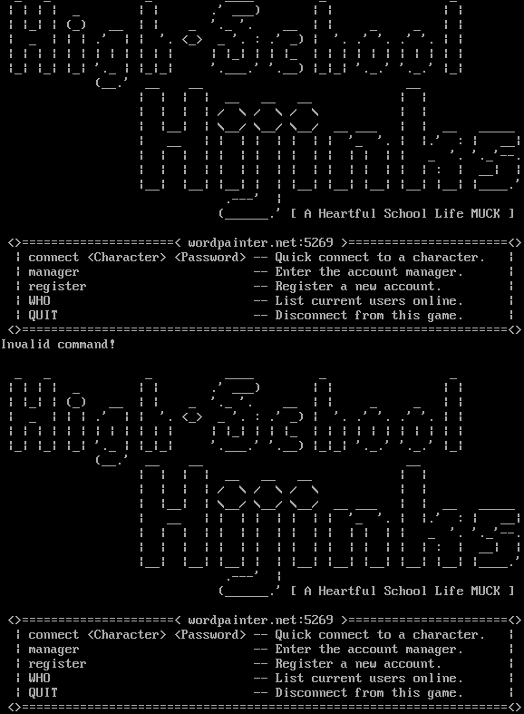_ _ _ _​___ _ _ \| \| \| \| _ \| \| .' ___) \| \| \| \| \| \|_\| \| (_) __ \| \| _ '._ '. __ \| \| _ _ \| \| \| _ \| \| \| .' \| \| '. <_> _ '. : .' _) \| '. .' '. .' '. \| \| \| \| \| \| \| \| \| \| \| \| \| \| \| \|_\| \| \| \|_ \| \| \| \| \| \| \| \| \| \| \| \|_\| \|_\| \|_\| '._ \| \|_\|_\| '.​___.' '.__) \|_\|_\| '._.' '._.' \|_\| (__.' __ __ __ \| \| \| \| __ __ __ \| \| \| \| \| \| / \\ / \\ / \\ \| \| \| \|__\| \| \\__/ \\__/ \\__/ __ ___ \| \| __ _​____ \| __ \| \| \| \| \| \| \| \| '_ '. \| \|.' : \| __\| \| \| \| \| \| \| \| \| \| \| \| \| \| \| \| _ '. '._'--. \| \| \| \| \| \| \| \| \| \| \| \| \| \| \| \| : \| __\| \| \|__\| \|__\| \|__\| \| \| \|__\| \|__\| \|__\| \|__\| \|__\| \|_​___.' .​---' \| (_​_____.' [ A Heartful School Life MUCK ] <>=​====================< wordpainter.net:5269 >=​=====================<> \| connect <Character> <Password> -- Quick connect to a character. \| \| manager -- Enter the account manager. \| \| register -- Register a new account. \| \| WHO -- List current users online. \| \| QUIT -- Disconnect from this game. \| <>=​==================================================================<> Invalid command! _ _ _ _​___ _ _ \| \| \| \| _ \| \| .' ___) \| \| \| \| \| \|_\| \| (_) __ \| \| _ '._ '. __ \| \| _ _ \| \| \| _ \| \| \| .' \| \| '. <_> _ '. : .' _) \| '. .' '. .' '. \| \| \| \| \| \| \| \| \| \| \| \| \| \| \| \|_\| \| \| \|_ \| \| \| \| \| \| \| \| \| \| \| \|_\| \|_\| \|_\| '._ \| \|_\|_\| '.​___.' '.__) \|_\|_\| '._.' '._.' \|_\| (__.' __ __ __ \| \| \| \| __ __ __ \| \| \| \| \| \| / \\ / \\ / \\ \| \| \| \|__\| \| \\__/ \\__/ \\__/ __ ___ \| \| __ _​____ \| __ \| \| \| \| \| \| \| \| '_ '. \| \|.' : \| __\| \| \| \| \| \| \| \| \| \| \| \| \| \| \| \| _ '. '._'--. \| \| \| \| \| \| \| \| \| \| \| \| \| \| \| \| : \| __\| \| \|__\| \|__\| \|__\| \| \| \|__\| \|__\| \|__\| \|__\| \|__\| \|_​___.' .​---' \| (_​_____.' [ A Heartful School Life MUCK ] <>=​====================< wordpainter.net:5269 >=​=====================<> \| connect <Character> <Password> -- Quick connect to a character. \| \| manager -- Enter the account manager. \| \| register -- Register a new account. \| \| WHO -- List current users online. \| \| QUIT -- Disconnect from this game. \| <>=​==================================================================<>