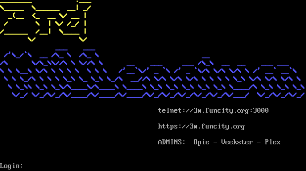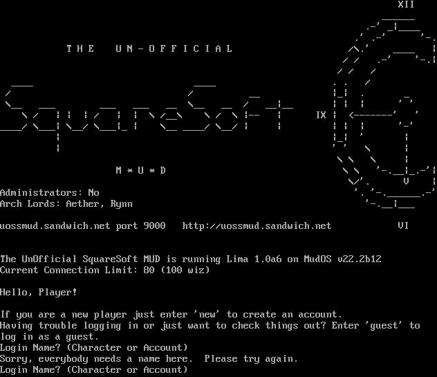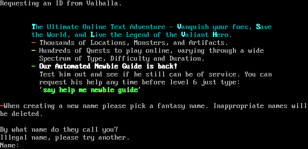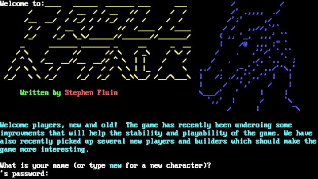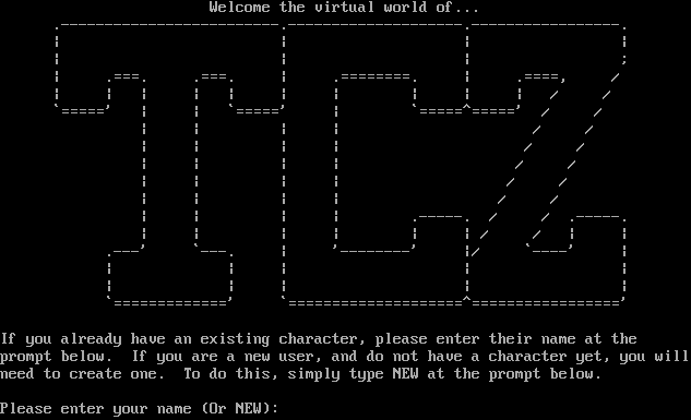 Welcome the virtual world of... .​-------------------------.--------------------.-----------------. \| \| \| \| \| \| \| ; \| .​===. .​===. \| .​========. \| .​====, / \| \| \| \| \| \| \| \| \| \| / / \`=​====' \| \| \`=​====' \| \`=​====^=====' / / \| \| \| \| / / \| \| \| \| / / \| \| \| \| / / \| \| \| \| / / \| \| \| \| / / \| \| \| \| .​-----. / / .​-----. \| \| \| \| \| \| / / \| \| .​---' \`-​--. \| '-​-------' \|/ \`-​---' \| \| \| \| \| \| \| \| \| \| \| \`=​============' \`=​===================^=================' If you already have an existing character, please enter their name at the prompt below. If you are a new user, and do not have a character yet, you will need to create one. To do this, simply type NEW at the prompt below. Please enter your name (Or NEW):