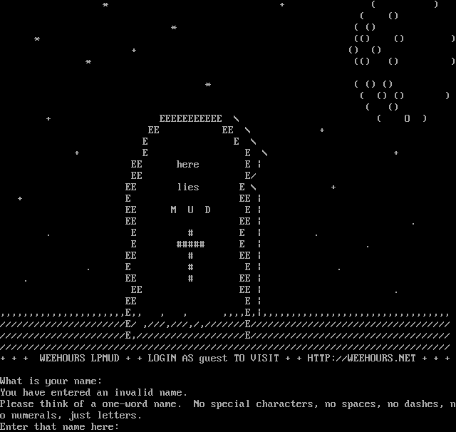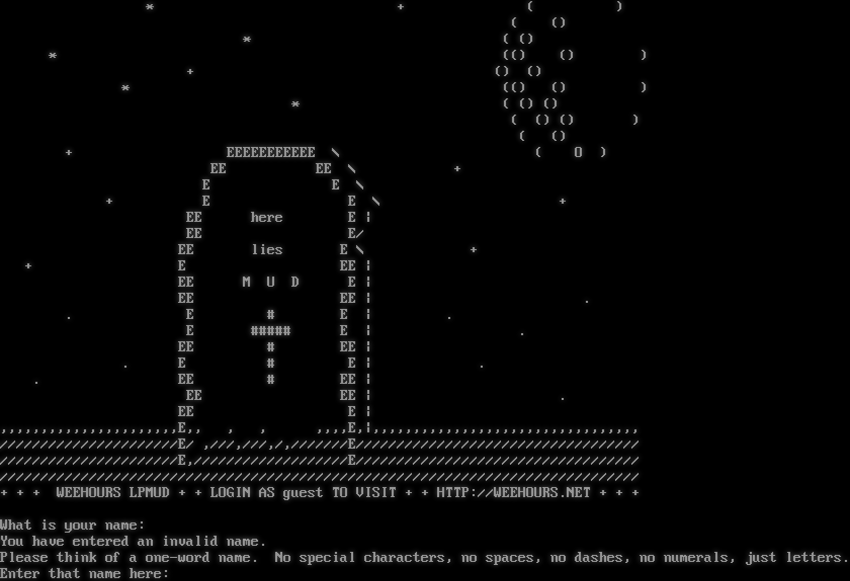 \* + ( ) ( () \* ( () \* (() () ) + () () \* (() () ) \* ( () () ( () () ) ( () + EEEEEEEEEEE \\ ( O ) EE EE \\ + E E \\ + E E \\ + EE here E \| EE E/ EE lies E \\ + + E EE \| EE M U D E \| EE EE \| . . E # E \| . E #​#### E \| . EE # EE \| . E # E \| . . EE # EE \| EE EE \| . EE E \| ,,,,,,,,,,,,,,,,,,,,,,E,, , , ,,,,E,\|,,,,,,,,,,,,,,,,,,,,,,,,,,,,,,,,, //////////////////////E/ ,///,///,/,///////E/////////////////////////////////// //////////////////////E,///////////////////E/////////////////////////////////// /////////////////////////////////////////////////////////////////////////////// + + + WEEHOURS LPMUD + + LOGIN AS guest TO VISIT + + HTTP://WEEHOURS.NET + + + What is your name: You have entered an invalid name. Please think of a one-word name. No special characters, no spaces, no dashes, no numerals, just letters. Enter that name here: