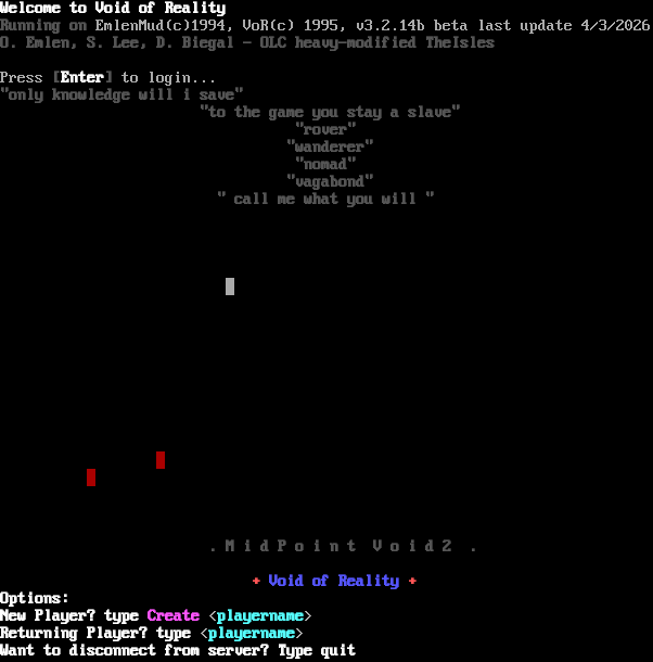 Welcome to Void of Reality Running on EmlenMud(c)1994, VoR(c) 1995, v3.2.14b beta last update 4/3/2026 O. Emlen, S. Lee, D. Biegal - OLC heavy-modified TheIsles Press [Enter] to login... "only knowledge will i save" "to the game you stay a slave" "rover" "wanderer" "nomad" "vagabond" " call me what you will " . M i d P o i n t V o i d 2 . + Void of Reality + Options: New Player? type Create <playername> Returning Player? type <playername> Want to disconnect from server? Type quit
