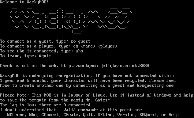 Welcome to WackyMOO! __ __ _ ___ ___ / / /\\ \\ \\__ _ ___\| \| ___ _ /\\/\\ /___\\/__ \\ \\ \\/ \\/ / _\` \|/ __\| \|/ / \| \| \|/ \\ // // / \| \\ /\\ / (_\| \| (__\| <\| \|_\| / /\\/\\ \\/ \\_/ \\_/ / \\/ \\/ \\__,_\|\\___\|_\|\\_\\\\__, \\/ \\/\\\\___/\\__/ \|___/ To connect as a guest, type: co guest To connect as a player, type: co <name> <player> To see who is connected, type: who To leave, type: @quit Check us out on the web: http://wackymoo.jellybean.co.uk:8888 WackyMOO is undergoing reorganization. If you have not connected within 1 year and 6 months, your character will have been recycled. Please feel free to create another one by connecting as a guest and @requesting one. Please Note: This MOO is in favour of Linux. Use it instead of Windows and help to save the penguin from the nasty Mr. Gates! The lag is low; there are 0 connected. I don't understand that. Valid commands at this point are WELcome, Who, COnnect, CReate, Quit, UPtime, Version, REQuest, or Help