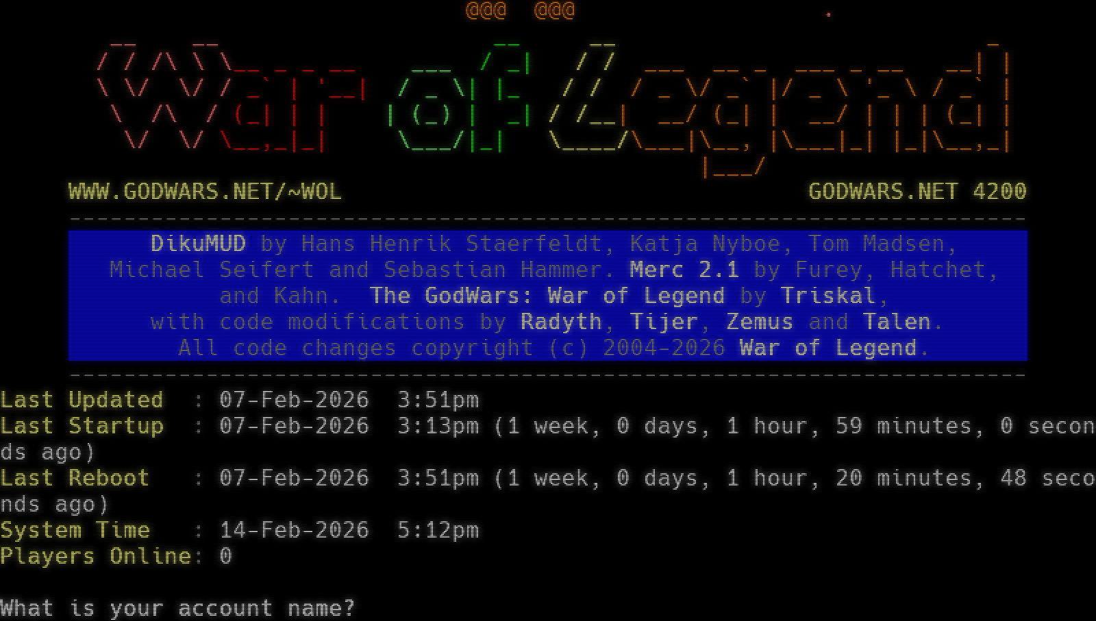 Please Wait, while we attempt to detect your client... <VERSION> [Client] xterm-256color \| [Colors] 256 \| [MXP] Yes \| [MSDP] Yes \| [NAWS] 80x25 _​_________ -​#########%%;-. /#​###########%%;\`\\ /#​##########%%%;,;,\\ \|#​###########;;;;;.,.\| \|#​##########%;;;;;.,.\| XX \|##/--\\#​###%;;;/--\\;,\| XX XX..X \|#\| o \\##%;/ o \|.\| X..XX XX.​....X \|##\\_​___/##%;\\_​___/.,\| X.​....XX XXXXX.​....XX \\#​########/\\;;;;;;,, / XX.​....XXXXX XX\|.​.....XX%,.@ \\#​#####/%;\\;;;;, / @#%,XX.​.....\| X XX\|.​....X @#%,.@ \|#​#####%%;;;;,.\| @#%,.@ X.​....\| X XX \\...X @#%,.@ \|# # # % ; ; ;,\| @#%,.@ X.../ X XX#\\.X @#%,.@ @#%,.@ X./ # ## X @#%,.@ @#%,.@ X # , '# #X @#%,.@ @#%,.@ X ## \`###X @#%,.@ @#%,.@ #​###' . ' ### @#%.,@ @#%,.@ ###\`' . ';' @#%.@#%,.@ ;'\` ' . ' @#%,.@ ,. \` , @#%,.@ @@ \` @@@ @@@ . __ __ __ __ _ / / /\\ \\ \\__ _ _ __ ___ / _\| / / ___ __ _ ___ _ __ __\| \| \\ \\/ \\/ / _\` \| '__\| / _ \\\| \|_ / / / _ \\/ _\` \|/ _ \\ '_ \\ / _\` \| \\ /\\ / (_\| \| \| \| (_) \| _\| / /__\| __/ (_\| \| __/ \| \| \| (_\| \| \\/ \\/ \\__,_\|_\| \\___/\|_\| \\_​___/\\___\|\\__, \|\\___\|_\| \|_\|\\__,_\| \|___/ WWW.GODWARS.NET/~WOL GODWARS.NET 4200 -​--------------------------------------------------------------------- DikuMUD by Hans Henrik Staerfeldt, Katja Nyboe, Tom Madsen, Michael Seifert and Sebastian Hammer. Merc 2.1 by Furey, Hatchet, and Kahn. The GodWars: War of Legend by Triskal, with code modifications by Radyth, Tijer, Zemus and Talen. All code changes copyright (c) 2004-2026 War of Legend. -​--------------------------------------------------------------------- Last Updated : 07-Feb-2026 3:51pm Last Startup : 07-Feb-2026 3:13pm (1 week, 0 days, 1 hour, 59 minutes, 0 seconds ago) Last Reboot : 07-Feb-2026 3:51pm (1 week, 0 days, 1 hour, 20 minutes, 48 seconds ago) System Time : 14-Feb-2026 5:12pm Players Online: 0 What is your account name?