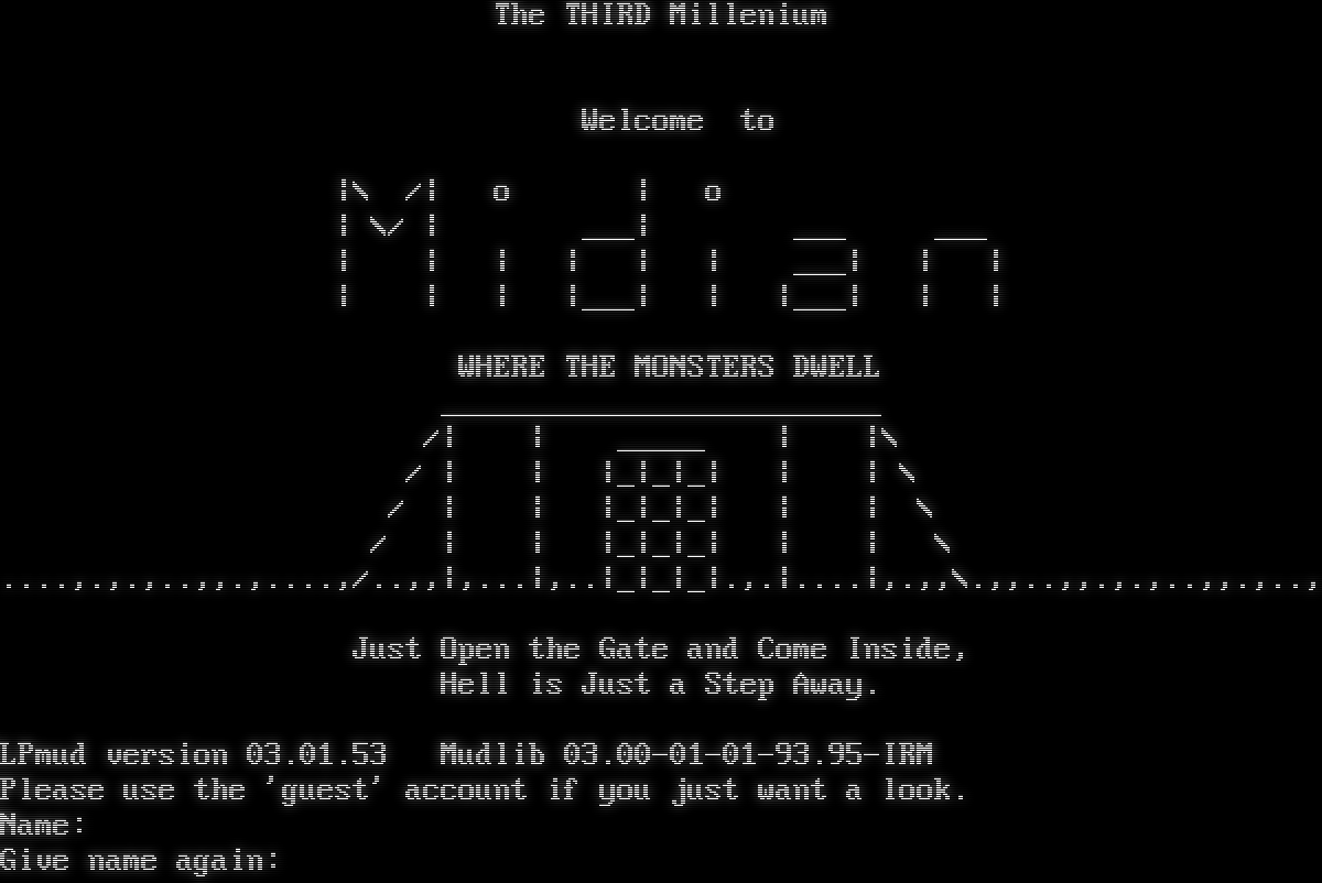 The THIRD Millenium Welcome to \|\\ /\| o \| o \| \\/ \| ___\| ___ ___ \| \| \| \| \| \| ___\| \| \| \| \| \| \|___\| \| \|___\| \| \| WHERE THE MONSTERS DWELL _​________________________ /\| \| _​____ \| \|\\ / \| \| \|_\|_\|_\| \| \| \\ / \| \| \|_\|_\|_\| \| \| \\ / \| \| \|_\|_\|_\| \| \| \\ .​...,.,.,..,,.,.​...,/..,,\|,...\|,..\|_\|_\|_\|.,.\|.​...\|,.,,\\.,,..,,.,.,..,,.,.., Just Open the Gate and Come Inside, Hell is Just a Step Away. LPmud version 03.01.53 Mudlib 03.00-01-01-93.95-IRM Please use the 'guest' account if you just want a look. Name: Give name again: