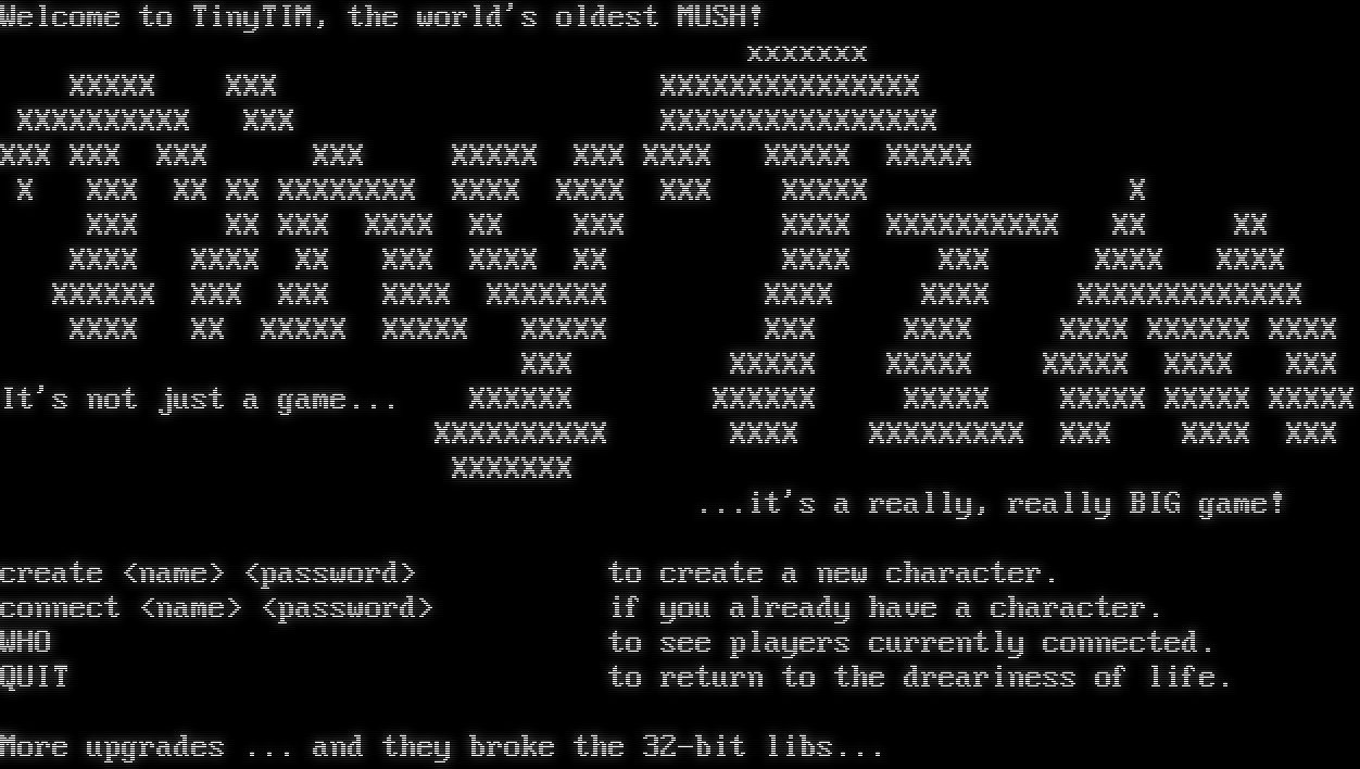 Welcome to TinyTIM, the world's oldest MUSH! xxxxxxx XXXXX XXX XXXXXXXXXXXXXXX XXXXXXXXXX XXX XXXXXXXXXXXXXXXX XXX XXX XXX XXX XXXXX XXX XXXX XXXXX XXXXX X XXX XX XX XXXXXXXX XXXX XXXX XXX XXXXX X XXX XX XXX XXXX XX XXX XXXX XXXXXXXXXX XX XX XXXX XXXX XX XXX XXXX XX XXXX XXX XXXX XXXX XXXXXX XXX XXX XXXX XXXXXXX XXXX XXXX XXXXXXXXXXXXX XXXX XX XXXXX XXXXX XXXXX XXX XXXX XXXX XXXXXX XXXX XXX XXXXX XXXXX XXXXX XXXX XXX It's not just a game... XXXXXX XXXXXX XXXXX XXXXX XXXXX XXXXX XXXXXXXXXX XXXX XXXXXXXXX XXX XXXX XXX XXXXXXX ...it's a really, really BIG game! create <name> <password> to create a new character. connect <name> <password> if you already have a character. WHO to see players currently connected. QUIT to return to the dreariness of life. More upgrades ... and they broke the 32-bit libs...