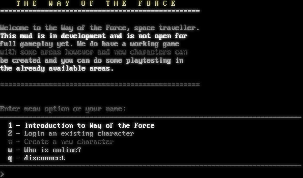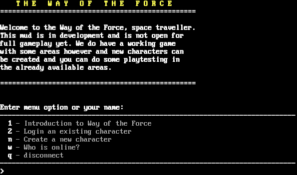 DGD 1.2.157-WOTF-NET / WOTF Kernel 0.84 T H E W A Y O F T H E F O R C E =​================================================ Welcome to the Way of the Force, space traveller. This mud is in development and is not open for full gameplay yet. We do have a working game with some areas however and new characters can be created and you can do some playtesting in the already available areas. =​================================================ Enter menu option or your name: -​------------------------------------------------------------------------- 1 - Introduction to Way of the Force 2 - Login an existing character n - Create a new character w - Who is online? q - disconnect -​------------------------------------------------------------------------- >