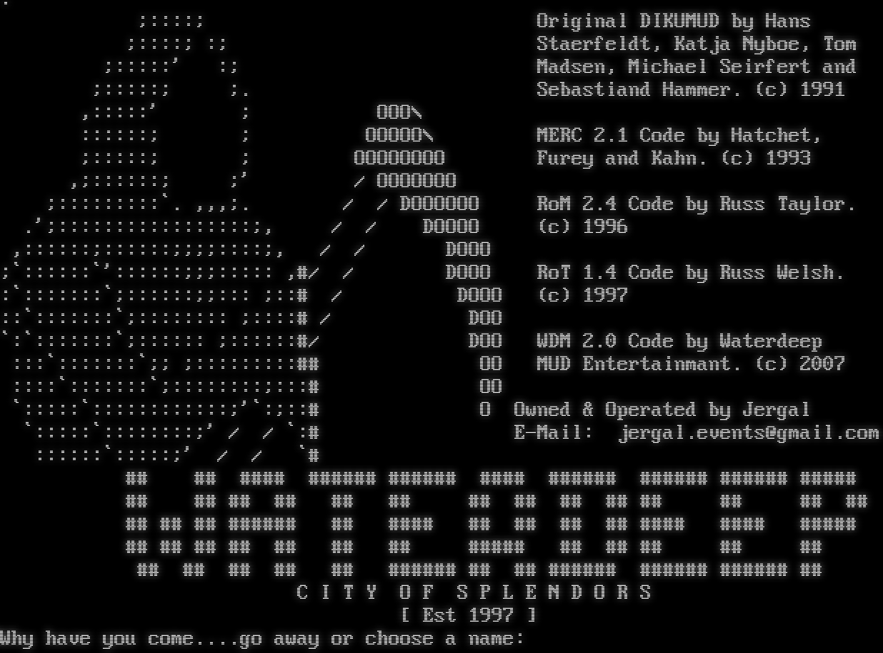 . ;::::; Original DIKUMUD by Hans ;::::; :; Staerfeldt, Katja Nyboe, Tom ;:::::' :; Madsen, Michael Seirfert and ;:::::; ;. Sebastiand Hammer. (c) 1991 ,:::::' ; OOO\\ ::::::; ; OOOOO\\ MERC 2.1 Code by Hatchet, ;:::::; ; OOOOOOOO Furey and Kahn. (c) 1993 ,;::::::; ;' / OOOOOOO ;:::::::::\`. ,,,;. / / DOOOOOO RoM 2.4 Code by Russ Taylor. .';:::::::::::::::::;, / / DOOOO (c) 1996 ,::::::;::::::;;;;::::;, / / DOOO ;\`::::::\`'::::::;;;::::: ,#/ / DOOO RoT 1.4 Code by Russ Welsh. :\`:::::::\`;::::::;;::: ;::# / DOOO (c) 1997 ::\`:::::::\`;:::::::: ;::::# / DOO \`:\`:::::::\`;:::::: ;::::::#/ DOO WDM 2.0 Code by Waterdeep :::\`:::::::\`;; ;:::::::::## OO MUD Entertainmant. (c) 2007 ::::\`:::::::\`;::::::::;:::# OO \`:::::\`::::::::::::;'\`:;::# O Owned & Operated by Jergal \`:::::\`::::::::;' / / \`:# E-Mail: jergal.events@gmail.com ::::::\`:::::;' / / \`# ## ## #​### #​##### #​##### #​### #​##### #​##### #​##### #​#### ## ## ## ## ## ## ## ## ## ## ## ## ## ## ## ## ## #​##### ## #​### ## ## ## ## #​### #​### #​#### ## ## ## ## ## ## ## #​#### ## ## ## ## ## ## ## ## ## ## #​##### ## ## #​##### #​##### #​##### ## C I T Y O F S P L E N D O R S [ Est 1997 ] Why have you come.​...go away or choose a name: