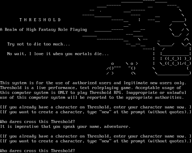 _​________-----_____ _​___------ __ -​---_ -- . _​__------ \\ -​----_______ -​--- __ \\ T H R E S H O L D -​----__ \| -​--__ _​____) __- / \\ A Realm of High Fantasy Role Playing _​______----- _​__-- \\ / \\ _​_____ -​--____ \\__/ / -​----------__ \\ -- _ /\\ Try not to die too much... -​-__--__ \\_​____/ \\_/\\ -​---\| / \| No wait, I love it when you mortals die... \| \|_​__________\| \| \| ((_(_)\| )_) o \\ o > \| \\_((_(_)\|/(_) /()~~~ ~() \\ ( / > <\\ \\_​____________) This system is for the use of authorized users and legitimate new users only. Threshold is a live performance, text roleplaying game. Acceptable usage of this computer system is ONLY to play Threshold RPG. Inappropriate or unlawful use of this computer system will be reported to the appropriate authorities. [If you already have a character on Threshold, enter your character name now. ] [If you want to create a character, type "new" at the prompt (without quotes).] Who dares cross this Threshold? It is imperative that you speak your name, adventurer. [If you already have a character on Threshold, enter your character name now. ] [If you want to create a character, type "new" at the prompt (without quotes).] Who dares cross this Threshold?