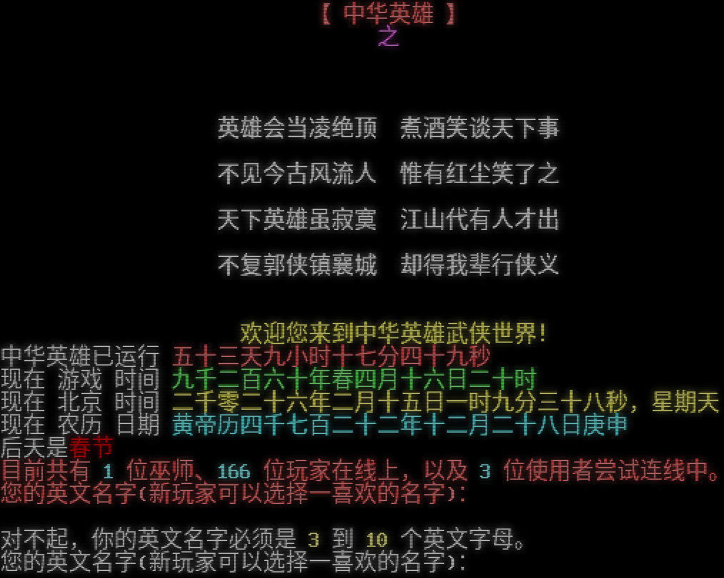 【 中华英雄 】 之 <<传奇延续>> 英雄会当凌绝顶 煮酒笑谈天下事 不见今古风流人 惟有红尘笑了之 天下英雄虽寂寞 江山代有人才出 不复郭侠镇襄城 却得我辈行侠义 欢迎您来到中华英雄武侠世界! 中华英雄已运行 五十三天九小时十七分四十九秒 现在 游戏 时间 九千二百六十年春四月十六日二十时 现在 北京 时间 二千零二十六年二月十五日一时九分三十八秒,星期天 现在 农历 日期 黄帝历四千七百二十二年十二月二十八日庚申 后天是春节 目前共有 1 位巫师、166 位玩家在线上,以及 3 位使用者尝试连线中。 您的英文名字(新玩家可以选择一喜欢的名字): 对不起,你的英文名字必须是 3 到 10 个英文字母。 您的英文名字(新玩家可以选择一喜欢的名字):
