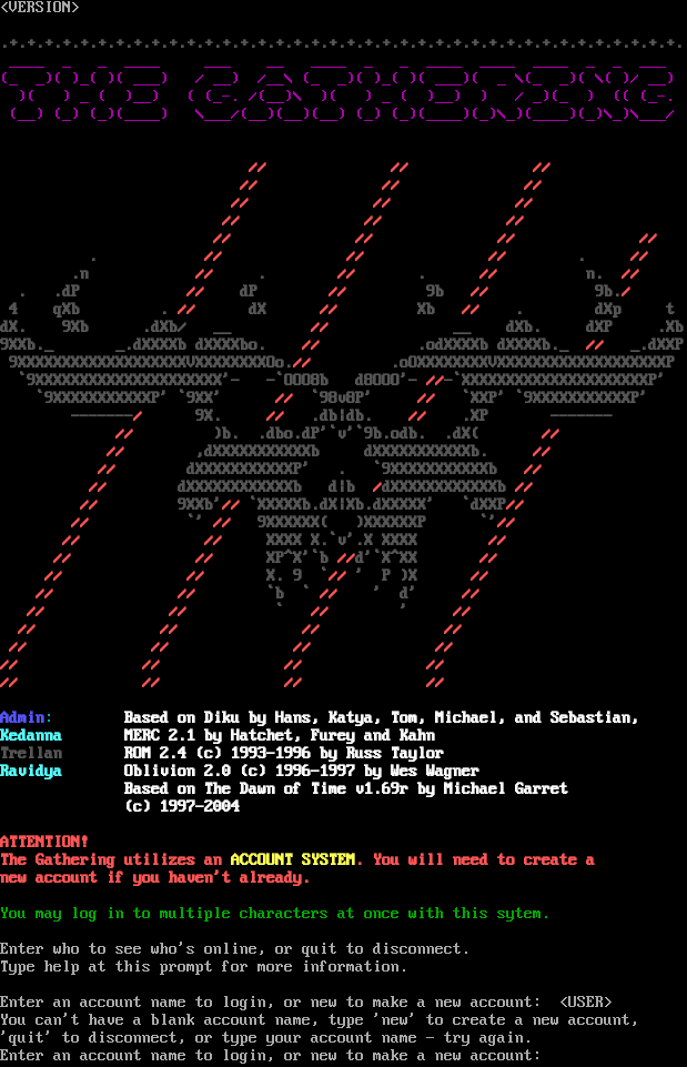 <VERSION> .​+.+.+.+.+.+.+.+.+.+.+.+.+.+.+.+.+.+.+.+.+.+.+.+.+.+.+.+.+.+.+.+.+.+.+.+.+.+. _​___ _ _ _​___ ___ __ _​___ _ _ _​___ _​___ _​___ _ _ ___ (_ _)( )_( )( ___) / __) /__\\ (_ _)( )_( )( ___)( _ \\(_ _)( \\( )/ __) )( ) _ ( )__) ( (_-. /(__)\\ )( ) _ ( )__) ) / _)(_ ) (( (_-. (__) (_) (_)(_​___) \\___/(__)(__)(__) (_) (_)(_​___)(_)\\_)(_​___)(_)\\_)\\___/ // // // // // // // // // // // // // // // // . // // // . // .n // . // . // n. // . .dP // dP // 9b // 9b./ 4 qXb . // dX // Xb // . dXp t dX. 9Xb .dXb/ __ // __ dXb. dXP .Xb 9XXb._ _.dXXXXb dXXXXbo. // .odXXXXb dXXXXb._ // _.dXXP 9XXXXXXXXXXXXXXXXXXXVXXXXXXXXOo.// .oOXXXXXXXXVXXXXXXXXXXXXXXXXXXXP \`9XXXXXXXXXXXXXXXXXXXXX'- -\`OOO8b d8OOO'- //-\`XXXXXXXXXXXXXXXXXXXXXP' \`9XXXXXXXXXXXP' \`9XX' // \`98v8P' // \`XXP' \`9XXXXXXXXXXXP' -​------/ 9X. // .db\|db. // .XP -​------ // )b. .dbo.dP'\`v'\`9b.odb. .dX( // // ,dXXXXXXXXXXXb dXXXXXXXXXXXb. // // dXXXXXXXXXXXP' . \`9XXXXXXXXXXXb // // dXXXXXXXXXXXXb d\|b /dXXXXXXXXXXXXb // // 9XXb'// \`XXXXXb.dX\|Xb.dXXXXX' \`dXXP// // \`' // 9XXXXXX( )XXXXXXP \`'// // // XXXX X.\`v'.X XXXX // // // XP^X'\`b //d'\`X^XX // // // X. 9 \`// ' P )X // // // \`b \` // ' d' // // // \` // ' // // // // // // // // // // // // // // // // // Admin: Based on Diku by Hans, Katya, Tom, Michael, and Sebastian, Kedanna MERC 2.1 by Hatchet, Furey and Kahn Trellan ROM 2.4 (c) 1993-1996 by Russ Taylor Ravidya Oblivion 2.0 (c) 1996-1997 by Wes Wagner Based on The Dawn of Time v1.69r by Michael Garret (c) 1997-2004 ATTENTION! The Gathering utilizes an ACCOUNT SYSTEM. You will need to create a new account if you haven't already. You may log in to multiple characters at once with this sytem. Enter who to see who's online, or quit to disconnect. Type help at this prompt for more information. Enter an account name to login, or new to make a new account: <USER> You can't have a blank account name, type 'new' to create a new account, 'quit' to disconnect, or type your account name - try again. Enter an account name to login, or new to make a new account: