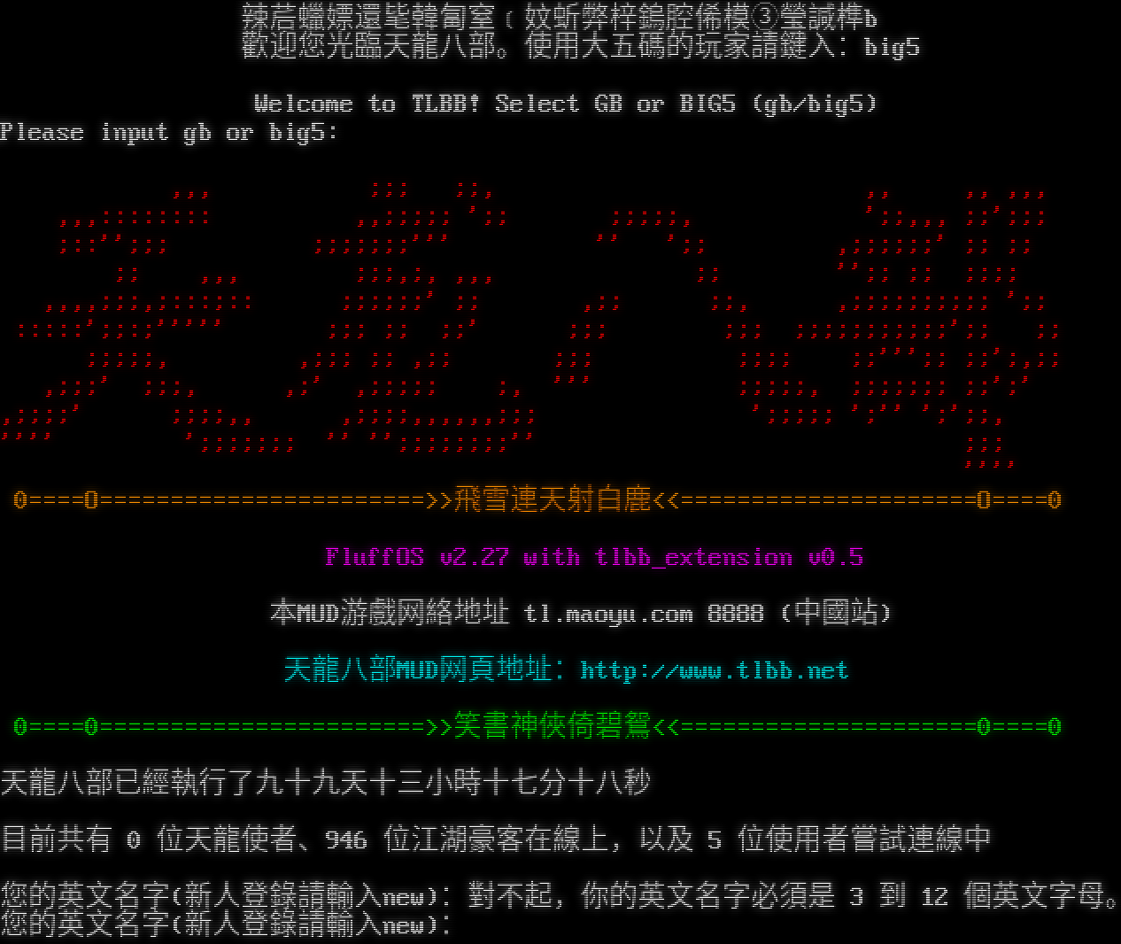 辣茩蠟嫖還毞韓匐窒﹝妏蚚弊梓鎢腔俙模③瑩諴榫b 歡迎您光臨天龍八部。使用大五碼的玩家請鍵入:big5 Welcome to TLBB! Select GB or BIG5 (gb/big5) Please input gb or big5: ,,, ;;; ;;, ,, ,, ,,, ,,,:::::::: ,,;;;;; ';; ;;;;;, ';;,,, ;;';;; ;::'';;; ;;;;;;;''' '' ';; ,;;;;;;' ;; ;; ;; ,,, ;;;,;, ,,, ;; '';; ;; ;;;; ,,,,;;;,;:::;:: ;;;;;;' ;; ,;; ;;, ,;;;;;;;;;; ';; :::::';;:;''''' ;;; ;; ;;' ;;; ;;; ;;;;;;;;;;;';; ;; ;;;;;, ,;;; ;; ,;; ;;; ;;;; ;;''';; ;;';,;; ,;;;' ;;;, ,;' ,;;;;; ;, ''' ;;;;;, ;;;;;;; ;;';' ,;;;;' ;;;;,, ,;;;;,,,,,,;;; ';;;;; ';'' ';';;, '''' ';;;;;;; '' '';;;;;;;;'' ;;; '''' 0=​===O=​======================>>飛雪連天射白鹿<<=​====================O=​===0 FluffOS v2.27 with tlbb_extension v0.5 本MUD游戲网絡地址 tl.maoyu.com 8888 (中國站) 天龍八部MUD网頁地址:http://www.tlbb.net 0=​===0=​======================>>笑書神俠倚碧鴛<<=​====================0=​===0 天龍八部已經執行了九十九天十三小時十七分十八秒 目前共有 0 位天龍使者、946 位江湖豪客在線上,以及 5 位使用者嘗試連線中 您的英文名字(新人登錄請輸入new):對不起,你的英文名字必須是 3 到 12 個英文字母。 您的英文名字(新人登錄請輸入new):