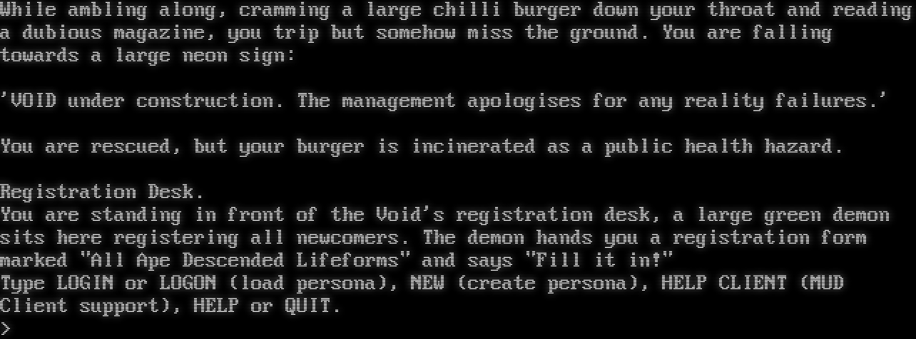 While ambling along, cramming a large chilli burger down your throat and reading a dubious magazine, you trip but somehow miss the ground. You are falling towards a large neon sign: 'VOID under construction. The management apologises for any reality failures.' You are rescued, but your burger is incinerated as a public health hazard. Registration Desk. You are standing in front of the Void's registration desk, a large green demon sits here registering all newcomers. The demon hands you a registration form marked "All Ape Descended Lifeforms" and says "Fill it in!" Type LOGIN or LOGON (load persona), NEW (create persona), HELP CLIENT (MUD Client support), HELP or QUIT. >