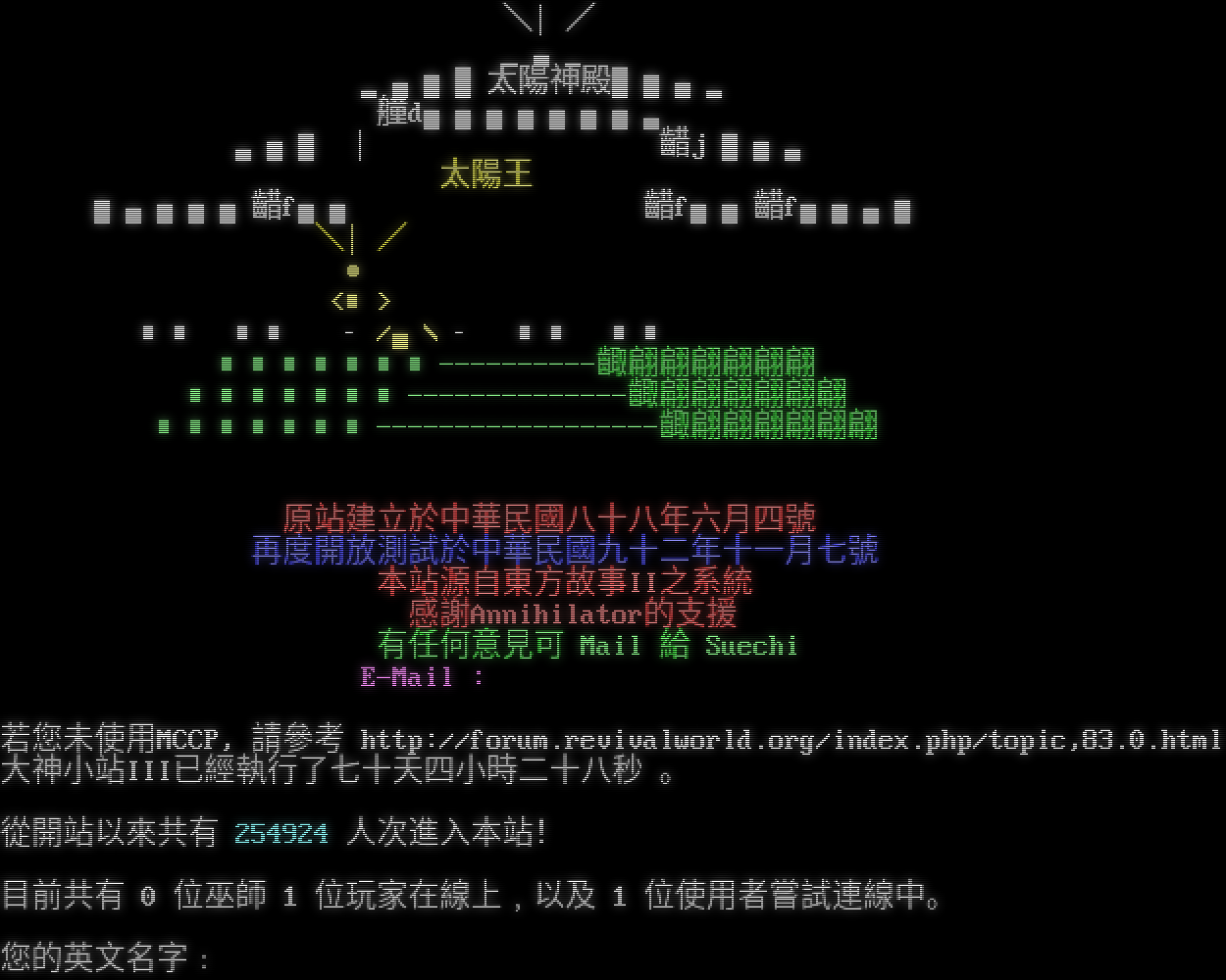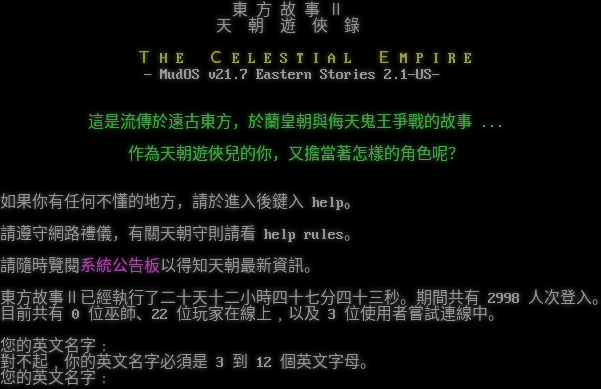 東 方 故 事 Ⅱ 天 朝 遊 俠 錄 T H E C E L E S T I A L E M P I R E - MudOS v21.7 Eastern Stories 2.1-US- 這是流傳於遠古東方,於蘭皇朝與侮天鬼王爭戰的故事 ... 作為天朝遊俠兒的你,又擔當著怎樣的角色呢? 如果你有任何不懂的地方,請於進入後鍵入 help。 請遵守網路禮儀,有關天朝守則請看 help rules。 請隨時覽閱系統公告板以得知天朝最新資訊。 東方故事Ⅱ已經執行了二十天十二小時四十七分四十三秒。期間共有 2998 人次登入。 目前共有 0 位巫師、22 位玩家在線上﹐以及 3 位使用者嘗試連線中。 您的英文名字﹕ 對不起﹐你的英文名字必須是 3 到 12 個英文字母。 您的英文名字﹕
