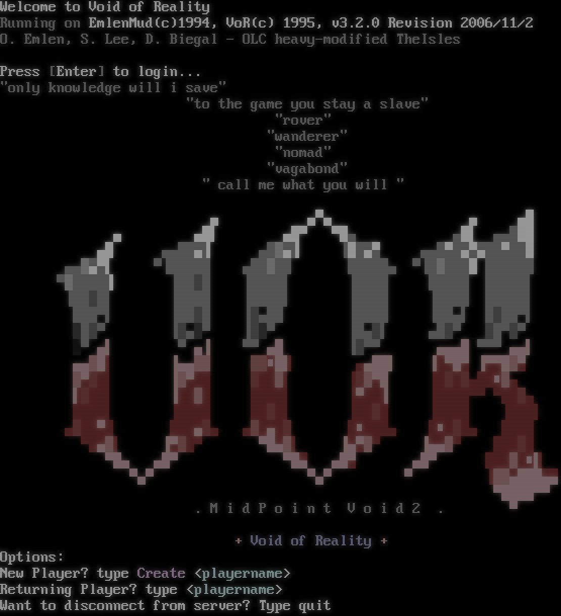 Welcome to Void of Reality Running on EmlenMud(c)1994, VoR(c) 1995, v3.2.0 Revision 2006/11/2 O. Emlen, S. Lee, D. Biegal - OLC heavy-modified TheIsles Press [Enter] to login... "only knowledge will i save" "to the game you stay a slave" "rover" "wanderer" "nomad" "vagabond" " call me what you will " ▄ ▄▀▄ ▄ ▄█ ▄ ▄█▌ ▄░▀ ▀█▄ ▄█▌ ▄▄█░█ ▄█ ▄▄██▀▌ ▄█▓▀▌ ▐░█▀▄ ▄▄█▄█▀▄▀██▄██░ ▄▄▓▀▄▌ ▀▐█████ ▄██▓██ █████▄ ▀▐█▓███ ██████ ▀▓████▌ ▐██▓█ ▐████▌ ▐████ █████ █████▌ ▐██▓█▌ ▐████ ▐████▌ ▐████ ▐████ █████▌ ███▀▌ ▐██▓█ ▐▓▄██ ▐████ ▐██▄▌ █▓██▀▌ ▒█▓▀ ▐▓▄▒▀ ▐▓▒▀ ▐█▄▓▌ ▄█▓▀ ▓█▀▓▀ ░▀ ▄▌ ▀ ▄▐ ▀▀ ▄█ ▐▓▀▀ ▄▄▄█ ▀▀▀ ▄▄▌ ▄▄▓█▌ ▐▄▄▓▓ ▒▒■█▌ ▄▄██▌ ▐█▀█▀ ▐▀▀█▓▀ ▓▀░█▌ ▐▓▀██ ░██▓▌ ▐░▓▀█ ▐█░█░▄██■▓▄ ▌░██▌ ▐██▓█ ████▌ ▐▀██▐ ▐████▀▀ ▀██░▄ ████▌ ▐████ ██░█▌ ▐██░█ ▐████ ▐███▌ ▄░██▀█ ███▄░▄ ▄▒ ▄█░ █■███▄ █■█░█▄ ████ ▀ ▄▓▌ ▐▀▒█▀ ▀█▄▓▌ ▐▄▀▓▀ ▐▄▄▓▀ ███░█ ▀█▄ ▄█▀ ▀█▄ ▄█▀ ▄█▀ ███▓█■▌ ▀▄▀ ▀▄▀ ▀ ▐▓▓▄███▄▄ ▀████▀▀ . M i d P o i n t V o i d 2 . ▀ + Void of Reality + Options: New Player? type Create <playername> Returning Player? type <playername> Want to disconnect from server? Type quit