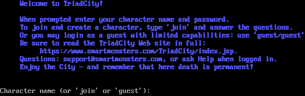 Welcome to TriadCity! When prompted enter your character name and password. To join and create a character, type 'join' and answer the questions. Or you may login as a guest with limited capabilities: use 'guest/guest' Be sure to read the TriadCity Web site in full: https://www.smartmonsters.com/TriadCity/index.jsp. Questions: support@smartmonsters.com, or ask Help when logged in. Enjoy the City - and remember that here death is permanent! Character name (or 'join' or 'guest'):