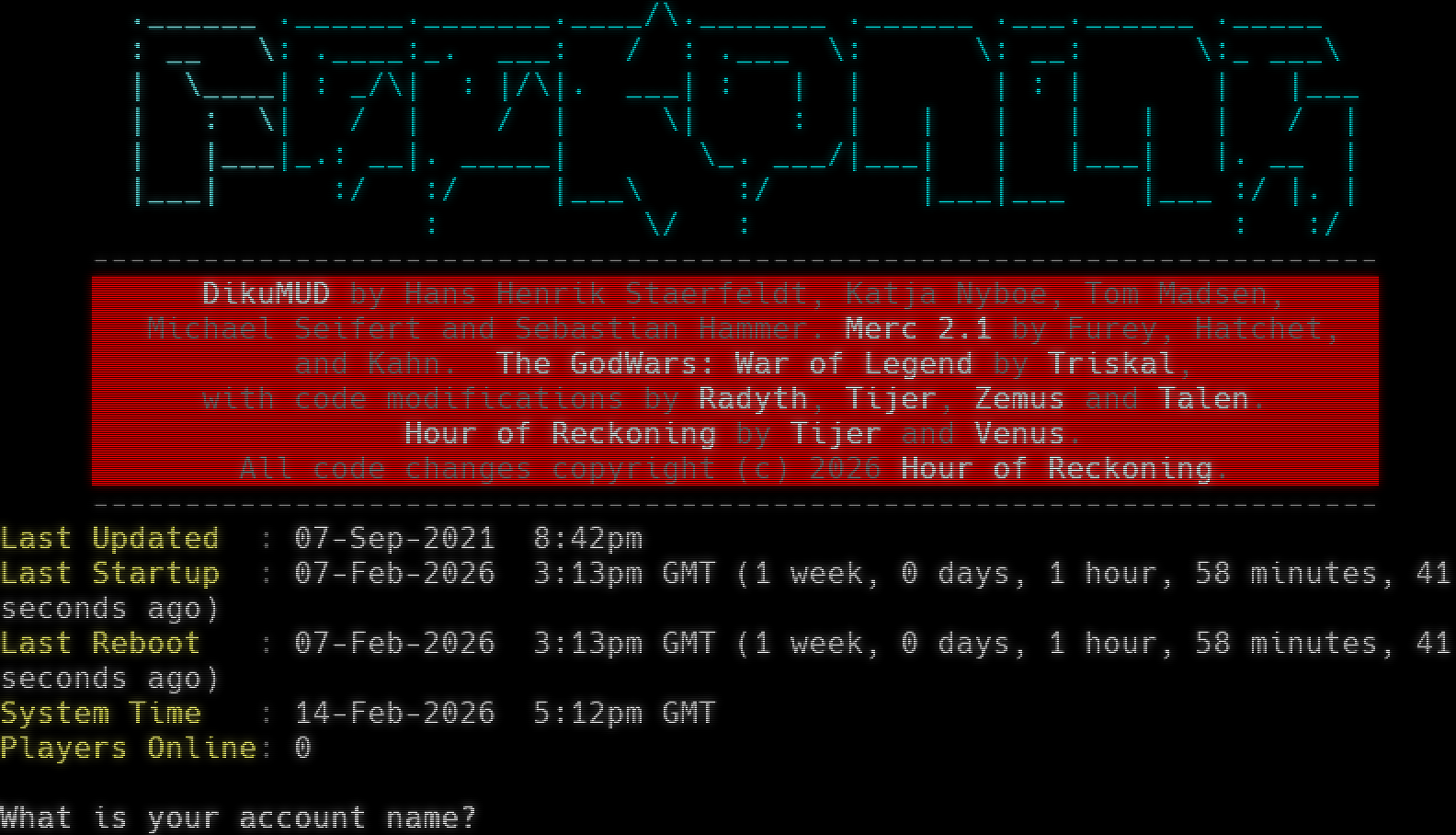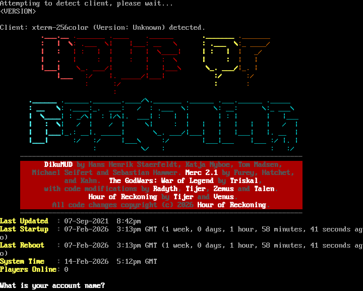 Attempting to detect client, please wait... <VERSION> Client: xterm-256color (Version: Unknown) detected. .​___.__ .​_______ .​____ .​______ .​_______ .​_______ : \| \\: .​___ \\\| \|___: __ \\ : .​___ \\:_ _​___/ \| : \| : \| \| \| \| \\_​___\| \| : \| \| _/ \| . \| : \| : \| : \\ \| : \| \| \|___\| \\_. ___/\| \| \|___\\ \\_. ___/\|_. \| \|___ :/ \|. _​____/\|___\| :/ :/ : :/ : : : .​______ .​______._______.____/\\.​_______ .​______ .​___.______ .​_____ : __ \\: .​____:_. ___: / : .​___ \\: \\: __: \\:_ ___\\ \| \\_​___\| : _/\\\| : \|/\\\|. ___\| : \| \| \| : \| \| \|___ \| : \\\| / \| / \| \\\| : \| \| \| \| \| \| / \| \| \|___\|_.: __\|. _​____\| \\_. ___/\|___\| \| \|___\| \|. __ \| \|___\| :/ :/ \|___\\ :/ \|___\|___ \|___ :/ \|. \| : \\/ : : :/ -​--------------------------------------------------------------------- DikuMUD by Hans Henrik Staerfeldt, Katja Nyboe, Tom Madsen, Michael Seifert and Sebastian Hammer. Merc 2.1 by Furey, Hatchet, and Kahn. The GodWars: War of Legend by Triskal, with code modifications by Radyth, Tijer, Zemus and Talen. Hour of Reckoning by Tijer and Venus. All code changes copyright (c) 2026 Hour of Reckoning. -​--------------------------------------------------------------------- Last Updated : 07-Sep-2021 8:42pm Last Startup : 07-Feb-2026 3:13pm GMT (1 week, 0 days, 1 hour, 58 minutes, 41 seconds ago) Last Reboot : 07-Feb-2026 3:13pm GMT (1 week, 0 days, 1 hour, 58 minutes, 41 seconds ago) System Time : 14-Feb-2026 5:12pm GMT Players Online: 0 What is your account name?