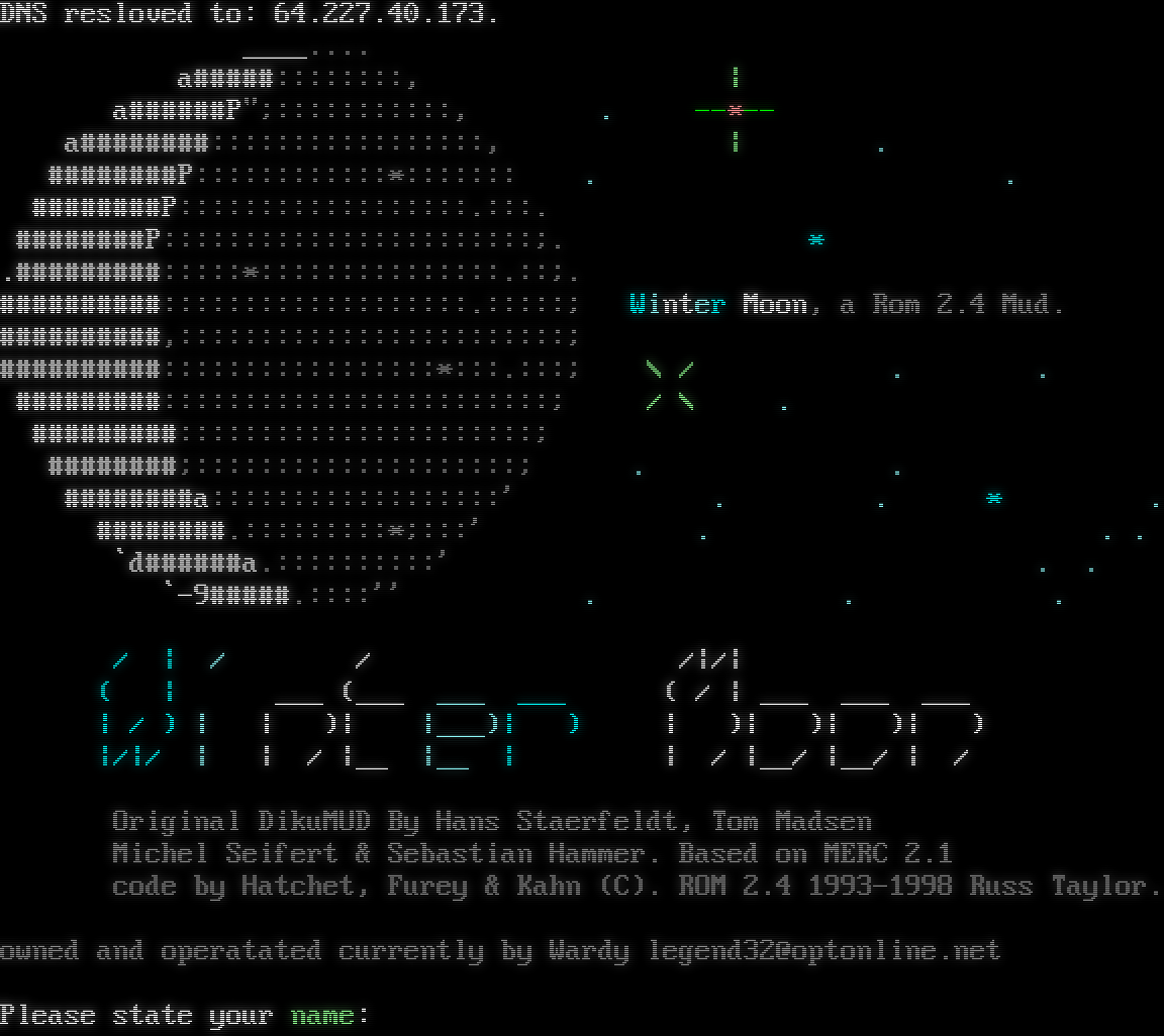 DNS resloved to: 64.227.40.173. _​___.... a#​####::::::::, \| a#​#####P";:::::::::::, . --\*-- a#​#######:::::::::::::::::, \| . #​#######P::::::::::::\*::::::: . . #​#######P::::::::::::::::::.:::. #​#######P:::::::::::::::::::::::;. \* .​#########:::::\*:::::::::::::::.::;. #​#########:::::::::::::::::::.:::::; Winter Moon, a Rom 2.4 Mud. #​#########,::::::::::::::::::::::::; #​#########:::::::::::::::::\*:::.:::; \\ / . . #​########::::::::::::::::::::::::; / \\ . #​########::::::::::::::::::::::; #​#######;::::::::::::::::::::; . . #​#######a::::::::::::::::::' . . \* . #​#######.:::::::::\*;:::' . . . \`d#​#####a.::::::::::' . . \`-9#​####.::::'' . . . / \| / / /\|/\| ( \| ___ (___ ___ ___ ( / \| ___ ___ ___ \| / ) \| \| )\| \|___)\| ) \| )\| )\| )\| ) \|/\|/ \| \| / \|__ \|__ \| \| / \|__/ \|__/ \| / Original DikuMUD By Hans Staerfeldt, Tom Madsen Michel Seifert & Sebastian Hammer. Based on MERC 2.1 code by Hatchet, Furey & Kahn (C). ROM 2.4 1993-1998 Russ Taylor. owned and operatated currently by Wardy legend32@optonline.net Please state your name: