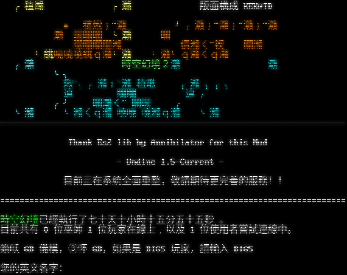 ╭稙灨 ╭灨 版面構成 KEK@TD ● 稙煍﹜~灨 ╯╭灨﹜~灨﹜~灨﹜~灨 灨 矙矙矙 ╰灨 矙 矙矙矙矙灨 僓灨ㄑ~禊 矙灨 ╰銚嘵嘵嘵銚q灨╰灨 ╰灨╰q灨ㄑq灨 ╭灨 時空幻境2灨 灨 ╰╮ 煍~╮╭灨﹜~灨 稙煍 ╭灨 ╮╭╮ 遉 矙矙 遉 ╭ ╭╯ 矙灨ㄑ~ 矙矙 ╭ ╰灨 ╰灨ㄑq灨 嘵嘵 嘵灨q灨 ╰灨 -​---------------------------------------------------------------------- Thank Es2 lib by Annihilator for this Mud - Undine 1.5-Current - 目前正在系統全面重整,敬請期待更完善的服務!! =​====================================================================== 時空幻境已經執行了七十天十小時十五分五十五秒 。 目前共有 0 位巫師 1 位玩家在線上﹐以及 1 位使用者嘗試連線中。 蝜岆 GB 俙模, ③怀 GB, 如果是 BIG5 玩家, 請輸入 BIG5 您的英文名字: