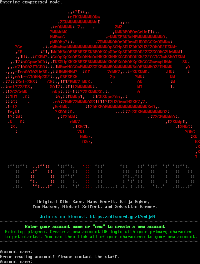 Entering compressed mode. .,:7I::,. :cTKKWWWWUOWm .2ZWWWWWWWWWWWWAI ,,.. .:mAWWWWW: 7.. . 2W2 7WWWAWG ,WWWBEAEAmGmUoII;.. NWEmAG .cWWWEEBWBANEWWWWWWWWWWO. pWBANp7;;. .7SWWWWAKAmDDDmmOUOOSGGKmOSWWm: 7Gm .:.mWKmKmAWWWWWWWWWWWWWWWWApSGNpSOU2DKD2U222OKAD2DEWWt ,2B ;2I,IWADKBAAEBEBBEEEWBEANKGpSDmKpSODDZSAD22ZZZCOKG2UmWWWI .,IU:..;CKBW7.;GAApKpKAAEEAANNAAANKKKKKNNKGGDODOUKK222CCTCTmKSK0TEWW ,.17;oGGpmmDGD:,.IWESUpKKKNBBEEBWWWWWWAKKAEKAANANKpKKGGGSmmmpUKWo SW. ,,.o7I000ZTTCDO;.:.IWBmmNGGGmEWWWZZSKEWWWBAWWWWWWWBAABBWWNO22ONWWW ,A .,,,tIco00T0ZUmBO.,::UKWKNNW7 ;0T 7AWK7,..:tKWEWWD. .UW: ; ,::,c0IctCTOKNpZO2:.,,0BEEEKN Zp 7WW: WW .;7;;;ZottZKS; GN;.,II12BWW7 WWK. . AW ;W ..;oot7722DS, SAI7;.;IItZWWWWWW;. WT I. .;12C2CcWW oWp:.;:t1;;77SKWWWZG.:. 0 ;;TUT .G; ;0,;;IWWWp1, ;ICUSWpo2Ao,.; ;;;G: . .c0:7KWK72WWWWASZIt117IZU2OmmANSKK7,7. .1tt2 ,KcUWW. :12DKKEABWWWWWWWWWWWWWWWWKmO,. Im,W1 7KDAU;0. ...:;7tZOKNWWWWWWWWO2; 17:;W: ,;T2DWW: .:7ZGEWWWAA;. .W 0; cWW7 ,I2EWWpI, :S. .IEBC1. .1SNWG: ; 7Wt 7OKG KWWc. :SW OSc, KS .E ,E T \|''\|\|''\| ..\|''\|\| '\|\|''\|. '\|\|' '\|\|' '\|\| \|\|' '\|\|' '\|' '\|\|''\|. \|\| .\|' \|\| \|\| \|\| \|\| \|\| \|\|\| \|\|\| \|\| \| \|\| \|\| \|\| \|\| \|\| \|\|''\|' \|\| \|\| \|'\|..'\|\| \|\| \| \|\| \|\| \|\| '\|. \|\| \|\| \|. \|\| \|\| \| '\|' \|\| \|\| \| \|\| \|\| .\|\|. ''\|...\|' .\|\|. '\|' .\|\|. .\|\|.​....\| .\|. \| .\|\|. '\|..' .\|\|...\|' Original Diku Base: Hans Henrik, Katja Nyboe, Tom Madsen, Michael Seifert, and Sebastian Hammer. Join us on Discord: https://discord.gg/t7edjzM -​=-=-=-=-=-=-=-=-=-=-=-=-=-=-=-=-=-=-=-=-=-=-=-=-=-=-=-=-=-=-=-=-=-=-=-=-=-=-=- Enter your account name or "new" to create a new account Existing players: Create a new account OR login with your primary character to get started. You can then link all of your characters to your new account. -​=-=-=-=-=-=-=-=-=-=-=-=-=-=-=-=-=-=-=-=-=-=-=-=-=-=-=-=-=-=-=-=-=-=-=-=-=-=-=- Account name: Error reading account! Please contact the staff. Account name: