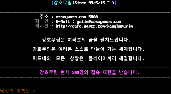 ^^ \*@@@@@@@@@ ^^ ^^ @@@@@@@@@@@@@@@ @@@@@@@@@@@@@@@@@@ ^^ @@@@@@@@@@@@@@@@@@@@ ~~~ ~~ ~​~~~ ~​~~~~~ ~~ &&&&&&&&&&&&&&&&&&&& ~​~~~~~~ ~​~~~~~~~~~ ~~~ ~ ~~ ~ ~ ~​~~~~~~~~~~~~~~~~~~~ ~ ~~ ~~ ~ ~ ~~ ~~ ~~ ~~ ~​~~~~~~~~~~~~ ~​~~~ ~ ~~~ ~ ~~~ ~ ~~ ~ ~~ ~ ~ ~​~~~~~ ~~ ~~~ ~~ ~ ~~ ~~ ~ ~ ~ ~ ~ ~ ~~ ~​~~~~~ ~ ~~ ~ ~~ ~ ~ ~ ~ ~~ ~ ~ 강호 무림 강호무림은 무림의 세계를 사랑하는 마음에서 제작하였습니다. 강호무림을 통하여 인생과 인류 및 우주의 존재에 대하여 깊이 통찰하고 도의 세계에 대한 깨달음을 얻기를 기원합니다. 엔터를 누르십시요. 【강호무림(Since 99/5/15 ~ )】 -​------------------------------------------------------------------------ 주소 : crazywars.com 5800 제 안 : E-Mail : yslim@crazywars.com 게시판 : http://cafe.naver.com/kanghomurim -​------------------------------------------------------------------------ 강호무림은 여러분의 꿈을 펼쳐드립니다. 강호무림은 여러분 스스로 만들어 가는 세계입니다. 머드내의 모든 상황은 플레어어끼리 해결합니다. -​------------------------------------------------------------------------ 강호무림 현재 200명의 접속 제한을 받습니다. -​------------------------------------------------------------------------ 당신의 이름은 ?