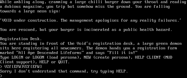 While ambling along, cramming a large chilli burger down your throat and reading a dubious magazine, you trip but somehow miss the ground. You are falling towards a large neon sign: 'VOID under construction. The management apologises for any reality failures.' You are rescued, but your burger is incinerated as a public health hazard. Registration Desk. You are standing in front of the Void's registration desk, a large green demon sits here registering all newcomers. The demon hands you a registration form marked "All Ape Descended Lifeforms" and says "Fill it in!" Type LOGIN or LOGON (load persona), NEW (create persona), HELP CLIENT (MUD Client support), HELP or QUIT. > VZf[EFW]VZf[EFW] Sorry I don't understand that command, try typing HELP. >