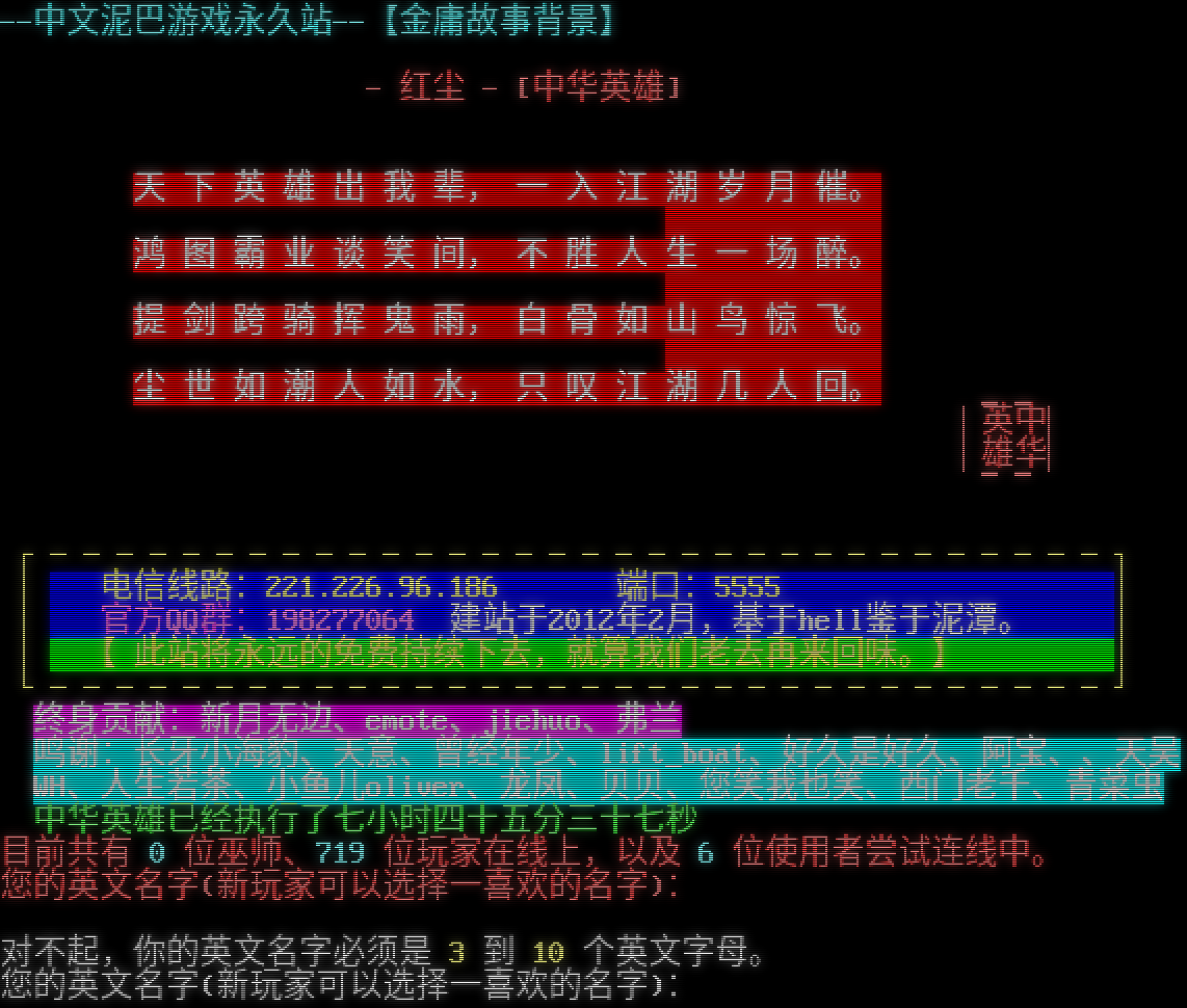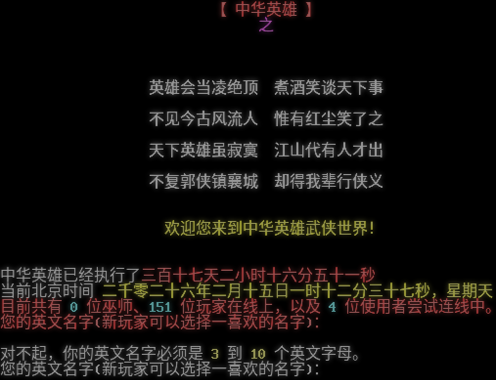 【 中华英雄 】 之 <<传奇延续>> 英雄会当凌绝顶 煮酒笑谈天下事 不见今古风流人 惟有红尘笑了之 天下英雄虽寂寞 江山代有人才出 不复郭侠镇襄城 却得我辈行侠义 欢迎您来到中华英雄武侠世界! 中华英雄已经执行了三百十七天二小时十六分五十一秒 当前北京时间 二千零二十六年二月十五日一时十二分三十七秒,星期天 目前共有 0 位巫师、151 位玩家在线上,以及 4 位使用者尝试连线中。 您的英文名字(新玩家可以选择一喜欢的名字): 对不起,你的英文名字必须是 3 到 10 个英文字母。 您的英文名字(新玩家可以选择一喜欢的名字):
