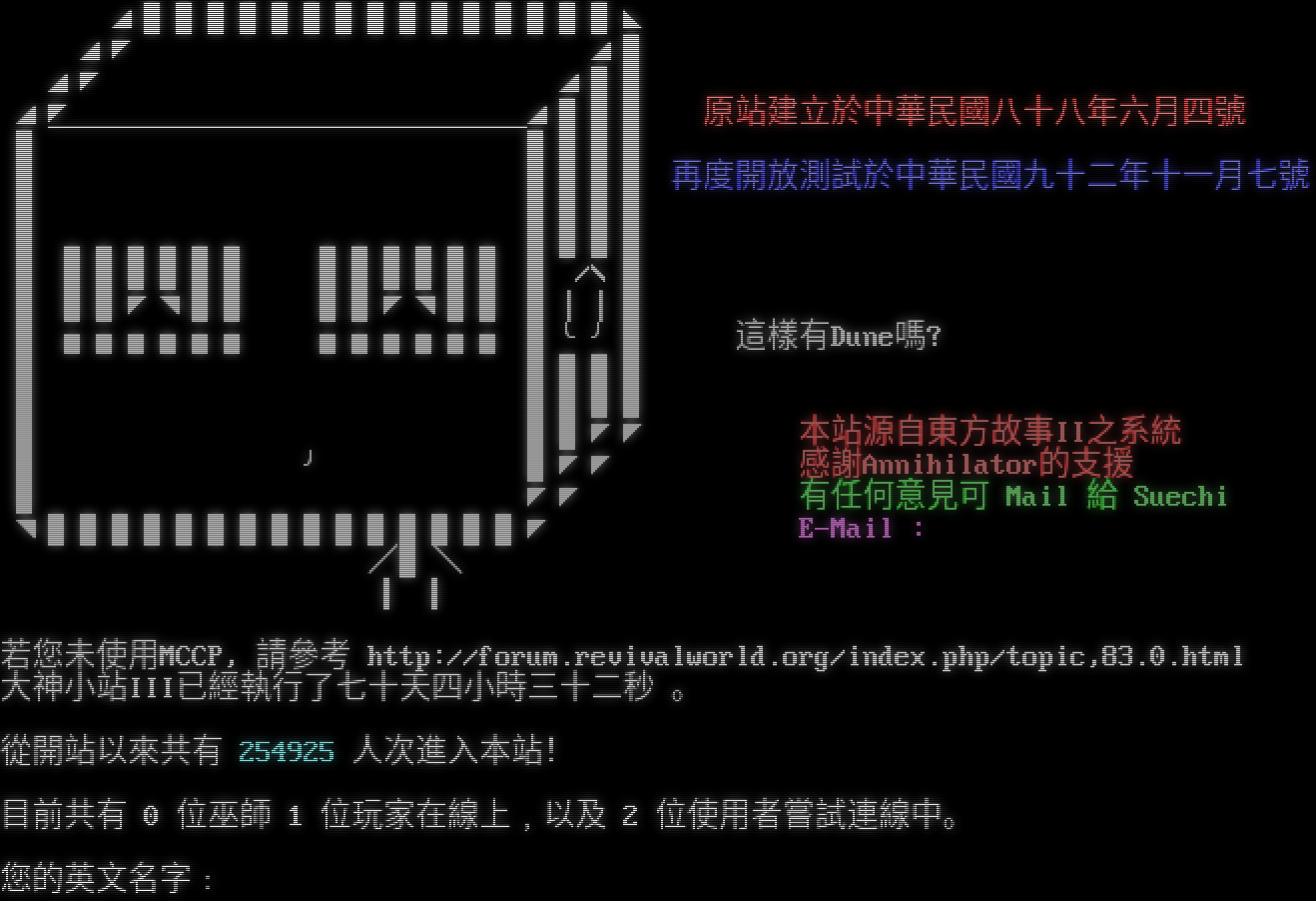 ◢███████████████◣ ◢◤ ◢█ 大神小站III ◢◤ ◢██ ◢◤ ◢███ 原站建立於中華民國八十八年六月四號 █ ̄ ̄ ̄ ̄ ̄ ̄ ̄ ̄ ̄ ̄ ̄ ̄ ̄ ̄ ̄████ █ ████ 再度開放測試於中華民國九十二年十一月七號 █ ████ █ ▃▃▃▃▃▃ ▃▃▃▃▃▃ ████ █ ██████ ██████ █ /\\ █ █ ██◤◥██ ██◤◥██ █∣∣█ █ ▅▅▅▅▅▅ ▅▅▅▅▅▅ █╰╯█ 這樣有Dune嗎? █ ████ █ ████ █ ██◤◤ 本站源自東方故事II之系統 █ ╯ █◤◤ 感謝Annihilator的支援 █ ◤◤ 有任何意見可 Mail 給 Suechi ◥███████████████◤ E-Mail : /█\ ▍ ▍ 若您未使用MCCP, 請參考 http://forum.revivalworld.org/index.php/topic,83.0.html 大神小站III已經執行了七十天四小時三十二秒 。 從開站以來共有 254925 人次進入本站! 目前共有 0 位巫師 1 位玩家在線上﹐以及 2 位使用者嘗試連線中。 您的英文名字﹕