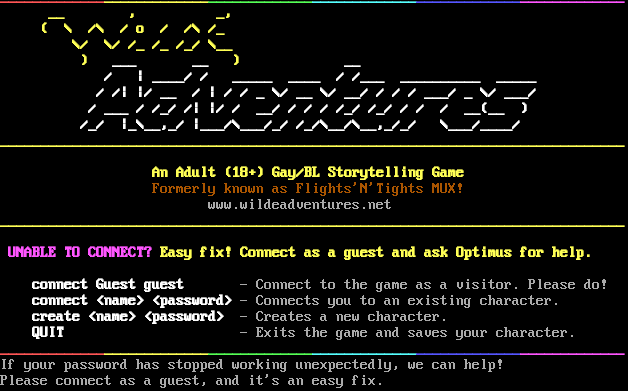 _​_____________________________________________________________________________ __ , _, ( \\ /\\ / o / /\\ /_ \\/ \\/ /_ /_ /_/ \\__ ) ___ __ ) __ / \| _​___/ / _​____ _​___ / /___ _​_________ _​____ / /\| \|/ __ / \| / / _ \\/ __ \\/ __/ / / / ___/ _ \\/ ___/ / ___ / /_/ /\| \|/ / __/ / / / /_/ /_/ / / / __(__ ) /_/ \|_\\__,_/ \|___/\\___/_/ /_/\\__/\\__,_/_/ \\___/_​___/ _​_____________________________________________________________________________ An Adult (18+) Gay/BL Storytelling Game Formerly known as Flights'N'Tights MUX! www.wildeadventures.net _​_____________________________________________________________________________ UNABLE TO CONNECT? Easy fix! Connect as a guest and ask Optimus for help. connect Guest guest - Connect to the game as a visitor. Please do! connect <name> <password> - Connects you to an existing character. create <name> <password> - Creates a new character. QUIT - Exits the game and saves your character. _​_____________________________________________________________________________ If your password has stopped working unexpectedly, we can help! Please connect as a guest, and it's an easy fix.