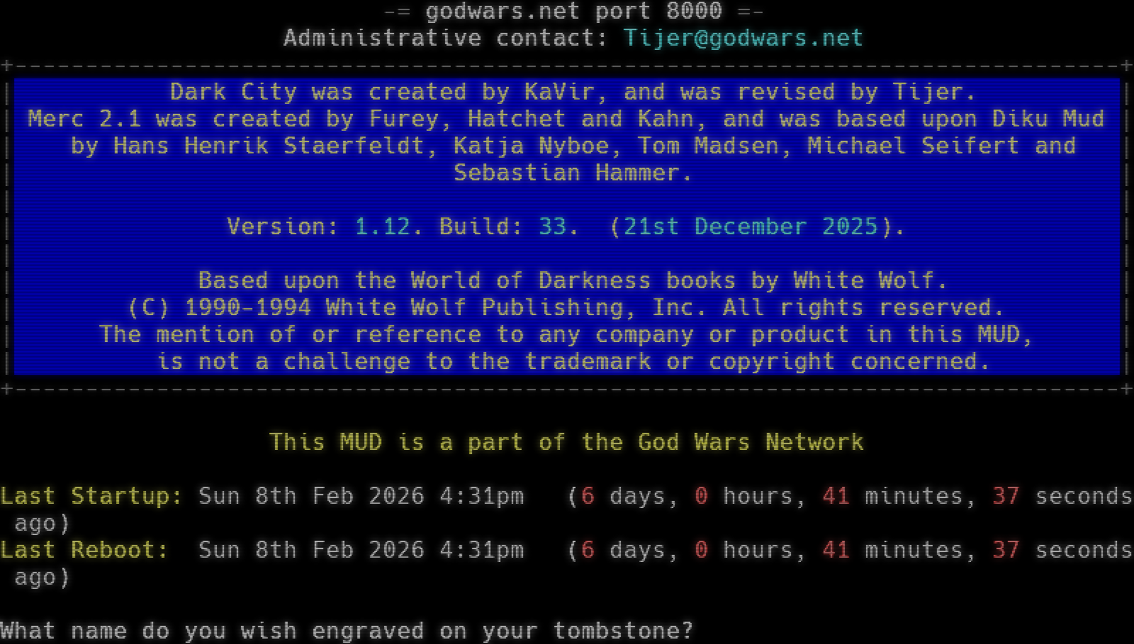 .​______ .​______ .​______ .​____/\\ .​_______ .​___ _​____._ _​___ _​___ :_ _ \\ : \\ : __ \\ : / \\ :_. ___\\: __\|\\__ _:\| \\ \\_/ / \| \| \|\| . \|\| \\_​___\|\|. ___/ \| : \|/\\ \| : \| \| :\| \\___ ___/ \| . \| \|\| : \|\| : \\ \| \\ \| / \\\| \| \| \| \| \| \|. _​___/ \|___\| \|\| \|___\\\| \\ \|. _​____/\| \| \| \| \|___\| :/ \|___\|\|___\| \|___\\ / :/ \|___\| \|___\| : \\/ : Revised -= godwars.net port 8000 =- Administrative contact: Tijer@godwars.net +​------------------------------------------------------------------------------+ \| Dark City was created by KaVir, and was revised by Tijer. \| \| Merc 2.1 was created by Furey, Hatchet and Kahn, and was based upon Diku Mud \| \| by Hans Henrik Staerfeldt, Katja Nyboe, Tom Madsen, Michael Seifert and \| \| Sebastian Hammer. \| \| \| \| Version: 1.12. Build: 33. (21st December 2025). \| \| \| \| Based upon the World of Darkness books by White Wolf. \| \| (C) 1990-1994 White Wolf Publishing, Inc. All rights reserved. \| \| The mention of or reference to any company or product in this MUD, \| \| is not a challenge to the trademark or copyright concerned. \| +​------------------------------------------------------------------------------+ This MUD is a part of the God Wars Network Last Startup: Sun 8th Feb 2026 4:31pm (6 days, 0 hours, 41 minutes, 37 seconds ago) Last Reboot: Sun 8th Feb 2026 4:31pm (6 days, 0 hours, 41 minutes, 37 seconds ago) What name do you wish engraved on your tombstone?