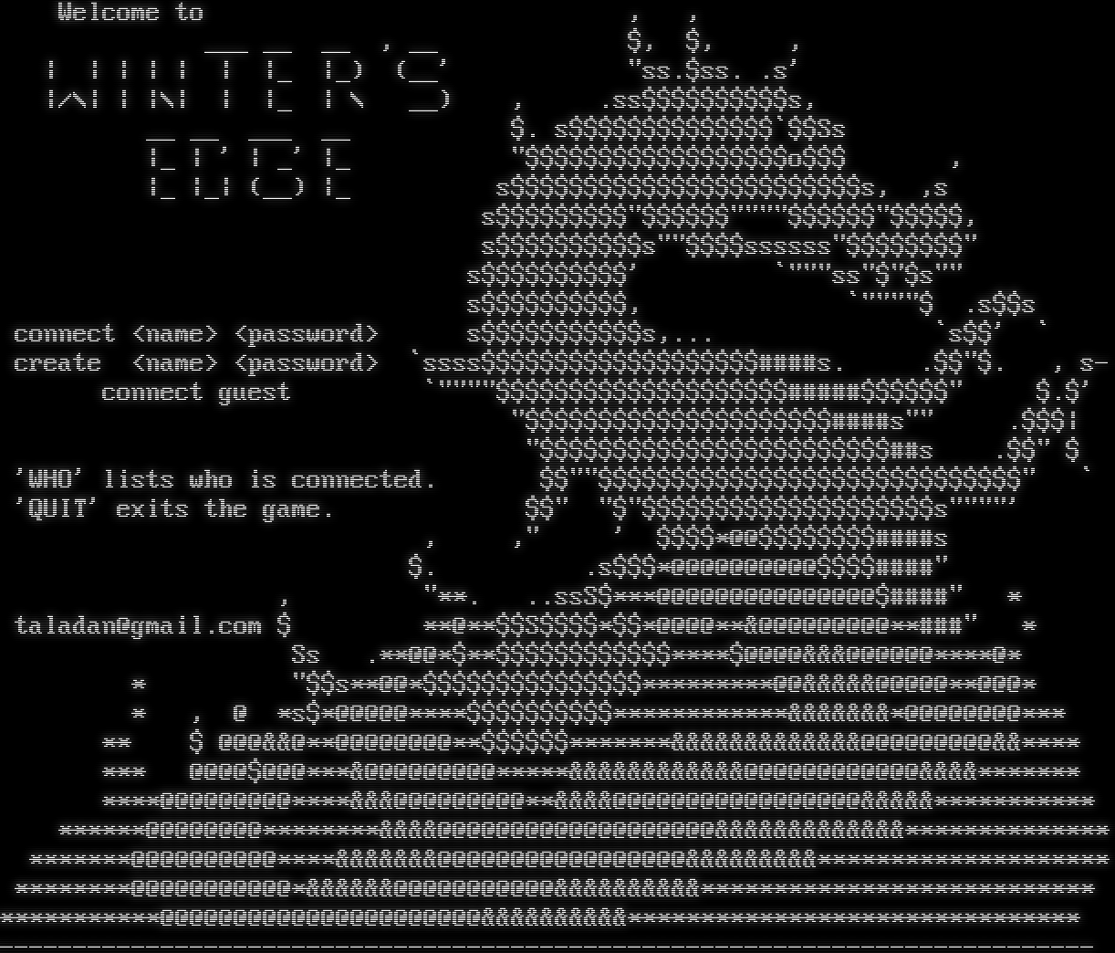 Welcome to , , ___ __ __ , __ $, $, , \| \| \| \| \| \| \|_ \|_) (__' "ss.$ss. .s' \|/\\\| \| \|\\\| \| \|_ \| \\ __) , .ss$$$$$$$$$$s, __ __ ___ __ $. s$$$$$$$$$$$$$$\`$$Ss \|_ \| ' \| _' \|_ "$$$$$$$$$$$$$$$$$$o$$$ , \|_ \|_\| (__) \|_ s$$$$$$$$$$$$$$$$$$$$$$$$s, ,s s$$$$$$$$$"$$$$$$"​"""$$$$$$"$$$$$, s$$$$$$$$$$s""$$$$ssssss"$$$$$$$$" s$$$$$$$$$$' \`"""ss"$"$s"" s$$$$$$$$$$, \`"​"""$ .s$$s connect <name> <password> s$$$$$$$$$$$s,... \`s$$' \` create <name> <password> \`ssss$$$$$$$$$$$$$$$$$$$#​###s. .$$"$. , s- connect guest \`"​"""$$$$$$$$$$$$$$$$$$$$#​####$$$$$$" $.$' "$$$$$$$$$$$$$$$$$$$$$#​###s"" .$$$\| "$$$$$$$$$$$$$$$$$$$$$$$$##s .$$" $ 'WHO' lists who is connected. $$""$$$$$$$$$$$$$$$$$$$$$$$$$$$$$" \` 'QUIT' exits the game. $$" "$"$$$$$$$$$$$$$$$$$$$$s"​"""' , ," ' $$$$\*@@$$$$$$$$#​###s $. .s$$$\*@@@@@@@@@@$$$$#​###" , "\*\*. ..ssS$\*\*\*@@@@@@@@@@@@@@@$#​###" \* taladan@gmail.com $ \*\*@\*\*$$S$$$$\*$$\*@@@@\*\*&@@@@@@@@@\*\*#​##" \* Ss .\*\*@@\*$\*\*$$$$$$$$$$$$\*\*\*\*$@@@@&&&@@@@@@\*\*\*\*@\* \* "$$s\*\*@@\*$$$$$$$$$$$$$$$\*\*\*\*\*\*\*\*\*@@&&&&&@@@@@\*\*@@@\* \* , @ \*s$\*@@@@@\*\*\*\*$$$$$$$$$$\*\*\*\*\*\*\*\*\*\*\*\*&&&&&&&\*@@@@@@@@\*\*\* \*\* $ @@@&&@\*\*@@@@@@@@\*\*$$$$$$\*\*\*\*\*\*\*&&&&&&&&&&&&&@@@@@@@@@&&\*\*\*\* \*\*\* @@@@$@@@\*\*\*&@@@@@@@@@\*\*\*\*\*&&&&&&&&&&&&@@@@@@@@@@@@&&&&\*\*\*\*\*\*\* \*\*\*\*@@@@@@@@@\*\*\*\*&&&@@@@@@@@@\*\*&&&&@@@@@@@@@@@@@@@@@&&&&&\*\*\*\*\*\*\*\*\*\*\* \*\*\*\*\*\*@@@@@@@@\*\*\*\*\*\*\*\*&&&&@@@@@@@@@@@@@@@@@@@&&&&&&&&&&&&&\*\*\*\*\*\*\*\*\*\*\*\*\*\* \*\*\*\*\*\*\*@@@@@@@@@@\*\*\*\*&&&&&&&@@@@@@@@@@@@@@@@@&&&&&&&&&\*\*\*\*\*\*\*\*\*\*\*\*\*\*\*\*\*\*\*\* \*\*\*\*\*\*\*\*@@@@@@@@@@@\*&&&&&&@@@@@@@@@@@&&&&&&&&&&\*\*\*\*\*\*\*\*\*\*\*\*\*\*\*\*\*\*\*\*\*\*\*\*\*\*\* \*\*\*\*\*\*\*\*\*\*\*@@@@@@@@@@@@@@@@@@@@@@&&&&&&&&&&\*\*\*\*\*\*\*\*\*\*\*\*\*\*\*\*\*\*\*\*\*\*\*\*\*\*\*\*\*\*\* -​--------------------------------------------------------------------------