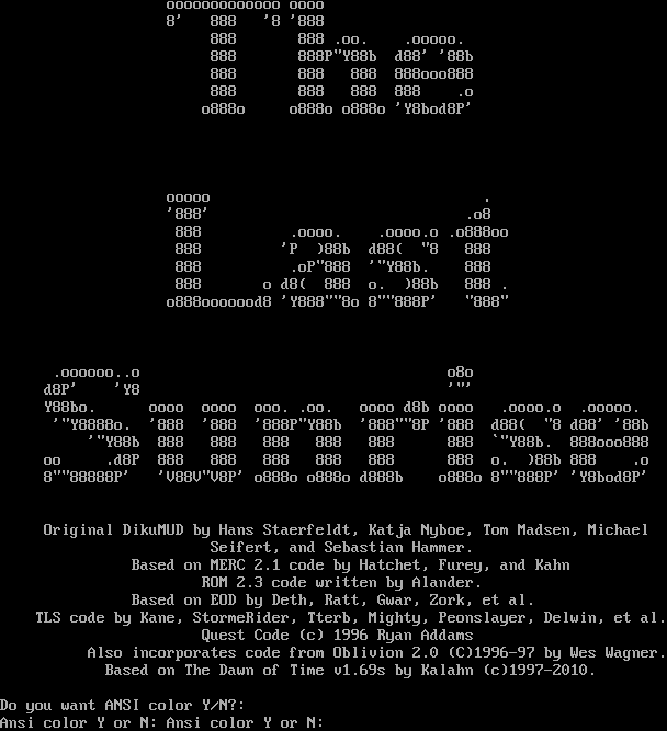 ooooooooooooo oooo 8' 888 '8 '888 888 888 .oo. .ooooo. 888 888P"Y88b d88' '88b 888 888 888 888ooo888 888 888 888 888 .o o888o o888o o888o 'Y8bod8P' ooooo . '888' .o8 888 .oooo. .oooo.o .o888oo 888 'P )88b d88( "8 888 888 .oP"888 '"Y88b. 888 888 o d8( 888 o. )88b 888 . o888ooooood8 'Y888""8o 8""888P' "888" .oooooo..o o8o d8P' 'Y8 '"' Y88bo. oooo oooo ooo. .oo. oooo d8b oooo .oooo.o .ooooo. '"Y8888o. '888 '888 '888P"Y88b '888""8P '888 d88( "8 d88' '88b '"Y88b 888 888 888 888 888 888 \`"Y88b. 888ooo888 oo .d8P 888 888 888 888 888 888 o. )88b 888 .o 8""88888P' 'V88V"V8P' o888o o888o d888b o888o 8""888P' 'Y8bod8P' Original DikuMUD by Hans Staerfeldt, Katja Nyboe, Tom Madsen, Michael Seifert, and Sebastian Hammer. Based on MERC 2.1 code by Hatchet, Furey, and Kahn ROM 2.3 code written by Alander. Based on EOD by Deth, Ratt, Gwar, Zork, et al. TLS code by Kane, StormeRider, Tterb, Mighty, Peonslayer, Delwin, et al. Quest Code (c) 1996 Ryan Addams Also incorporates code from Oblivion 2.0 (C)1996-97 by Wes Wagner. Based on The Dawn of Time v1.69s by Kalahn (c)1997-2010. Do you want ANSI color Y/N?: Ansi color Y or N: Ansi color Y or N: