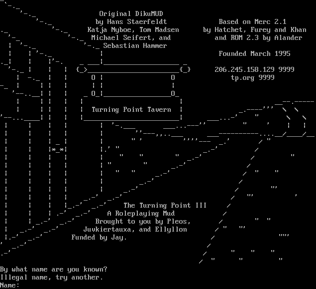 _ \`-._ '-._ Original DikuMUD '-._ by Hans Staerfeldt Based on Merc 2.1 ._ '-._ Katja Nyboe, Tom Madsen by Hatchet, Furey and Khan '-_ '-._ Michael Seifert, and and ROM 2.3 by Alander \| '-._ '-._ Sebastian Hammer \| \| '-._ \| Founded March 1995 ._\| \| \|'-. _ ___\|_​__________________ _ '-._ \| \| \| {_>_​______________________{_} 206.245.158.129 9999 \| -._ \| \| O \| O tp.org 9999 -_ \| \| \| \| \| \| \| '-​-..__\| \| \| _ O_\|_​________________O_ \| \| \| \| \| \| _​_--.----- \| \| \| \| \| Turning Point Tavern \| _​.----''' \\ \\ '-​-...____\| \| \| \|_​_______________________\| _​__...-' " \\ \\ \| \| \| \| \| '-​.___ _​__...---'' " ' \| \| \| \| \| \| \| ''---,,.​.___ _​__----------....__/_​___/__ \| \| \| _ \| \| " ' ''''--- _.' / " \| \| \|\*_\*\| \|.' " _.-' / \| \| \| \| \| " " " _.-' / " \| \| \| \| \| " " _.-' / \| \| \| \| \| " " _.-' / " " \| \| \| \| \| _.-' / \| \| \| \| \| _.-' / "' \| \| \| \| _.-' _.-' / "' ' \| \| \| \|_.-' _.-' The Turning Point III / \| \| \| .-' _.-' A Roleplaying Mud / \| \| _.-' _.-' Brought to you by Pleos, / " " \| _.-' _.-' Juvkiertauxa, and Ellyllon / " "' \|.-' _.-' Funded by Jay. / ""' ' _.-' / .-' / " " " / " " " By what name are you known? Illegal name, try another. Name: