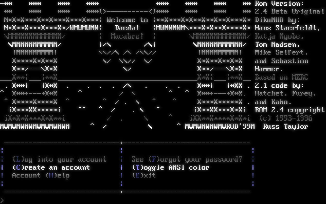 -\*\* \*\*\* \*\*\* \*\*\* \*\*\* \*\*\* \*\*\* \*\* Rom Version: \*\* \*\*\* \*\*\* \*\*\*(>-​---------<)\*\*\* \*\*\* \*\*\* \*\* 2.4 Beta Original N\*X\*X\*\*\*X\*\*X\*\*\*X\*\*\*X\*\*\*\| Welcome to \|\*\*X\*\*\*X\*X\*\*X\*\*X\*\*X\*\*\*X\* DikuMUD by: N\*X\*\*X\*\*\*X\*\*\*X\*/WMWMWMW\| Daedal \|MWMWMWM\\\*\*\*X\*X\*\*X\*\*\*\*X\* Hans Staerfeldt, \\MMMMMMMMMMMMM/ \| Macabre! \| \\MMMMMMMMMMMMM/ Katja Nyobe, \\MMMMMMMMMMM/ \|/\\ /\\\| \\MMMMMMMMMMM/ Tom Madsen, \|MMMMMMMMM\| \\\\//\\ /\\ /\\\\// \|MMMMMMMMM\| Mike Seifert, X\*\*\*\*X\*X\*\*X \\/ \\\\// \\/ X\*X\*\*X\*\*X\*X and Sebastion X\*\*/---\\X\*X \\/ X\*\*/---\\X\*X Hammer. ___X\*\*\|___\|\*\*X_​_________________________________X\*X\|___\|\*\*X__ Based on MERC . X\*\*\| \|X\*X . . . . /\\ . . . X\*\*\| \|\*XX . 2.1 code by: ^ X\*\*+​---+X\*X ^ / \\ ^ ^ X\*\*+​---+X\*X. Hatchet, Furey, ^ X\*\*\*\*X\*\*\*\*X ^ ^ / . \\ ^ ^ X\*\*\*X\*\*\*\*\*X . and Kahn. iX\*\*\*XX\*\*\*\*\*i ^^ ^ / . \\ ^ iX\*\*XX\*\*\*X\*Xi ROM 2.4 copyright iX\*X\*X\*\*\*X\*X\*\*i / . \\ ^ iXX\*\*X\*\*\*\*X\*X\*i (c) 1993-1996 MWMWMWMWMWMWMWMWM ^ / \\ ^ MWMWMWMWMWROD'99M Russ Taylor -​---------------------------+------------------------------- \| \| \| \| (L)og into your account \| See (F)orgot your password? \| \| (C)reate an account \| (T)oggle ANSI color \| \| Account (H)elp \| (E)xit \| \| \| \| -​---------------------------+------------------------------- >