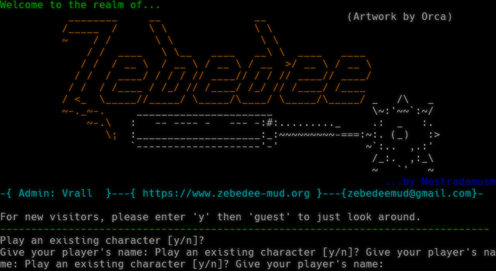 Welcome to the realm of... _​_______ __ __ (Artwork by Orca) /_​____ / \\ \\ \\ \\ ~ / / \\ \\ \\ \\ / / _​___ \\ \\__ _​___ __\\ \\ _​___ _​___ / / / __ \\ / __ \\ / __ \\ / __ >/ __ \\ / __ \\ / / / _​___/ / / / // _​___// / / // _​___// _​___/ / / / /_​___ / /_/ // /_​___/ /_/ // /_​___/ /_​___ / <_ \\_​____//_​____/ \\_​____/\\_​___/ \\_​____/\\_​____/ _ /\\ _ ~​-._~-. _​_____________________ \\~:'~~\`:~/ ~-.\\ : -- -​--- - --- -:#:.​........_ .: _ :. \\; :_​___________________:_:~​~~~~~~~~-===:~:. (_) :> \`-​-------------------'-' ~\`:.. ,.:' /_:. ,:_\\ ~ \`' ~ ...by Nostradamus0m -{ Admin: Vrall }---{ https://www.zebedee-mud.org }---{zebedeemud@gmail.com}- For new visitors, please enter 'y' then 'guest' to just look around. -​------------------------------------------------------------------------------ Play an existing character [y/n]? Give your player's name: Play an existing character [y/n]? Give your player's name: Play an existing character [y/n]? Give your player's name: