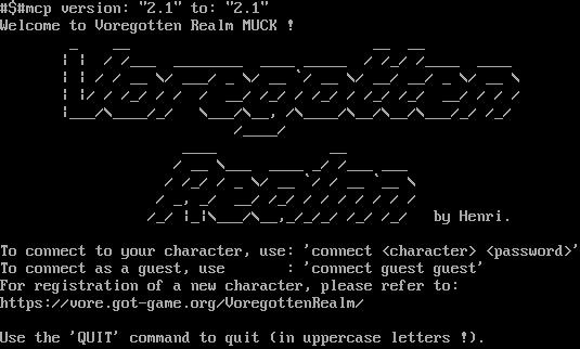 #$#mcp version: "2.1" to: "2.1" Welcome to Voregotten Realm MUCK ! _ __ __ __ \| \| / /___ _​_______ _​___ _​____ / /_/ /_​___ _​___ \| \| / / __ \\/ ___/ _ \\/ __ \`/ __ \\/ __/ __/ _ \\/ __ \\ \| \|/ / /_/ / / / __/ /_/ / /_/ / /_/ /_/ __/ / / / \|___/\\_​___/_/ \\___/\\__, /\\_​___/\\__/\\__/\\___/_/ /_/ /_​___/ _​___ __ / __ \\___ _​___ _/ /___ ___ / /_/ / _ \\/ __ \`/ / __ \`__ \\ / _, _/ __/ /_/ / / / / / / / /_/ \|_\|\\___/\\__,_/_/_/ /_/ /_/ by Henri. To connect to your character, use: 'connect <character> <password>' To connect as a guest, use : 'connect guest guest' For registration of a new character, please refer to: https://vore.got-game.org/VoregottenRealm/ Use the 'QUIT' command to quit (in uppercase letters !).