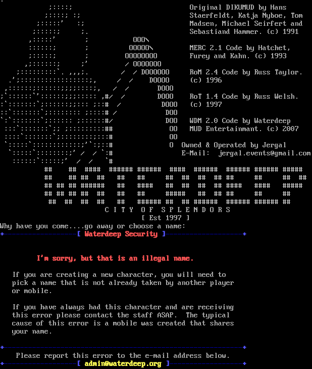 . ;::::; Original DIKUMUD by Hans ;::::; :; Staerfeldt, Katja Nyboe, Tom ;:::::' :; Madsen, Michael Seirfert and ;:::::; ;. Sebastiand Hammer. (c) 1991 ,:::::' ; OOO\\ ::::::; ; OOOOO\\ MERC 2.1 Code by Hatchet, ;:::::; ; OOOOOOOO Furey and Kahn. (c) 1993 ,;::::::; ;' / OOOOOOO ;:::::::::\`. ,,,;. / / DOOOOOO RoM 2.4 Code by Russ Taylor. .';:::::::::::::::::;, / / DOOOO (c) 1996 ,::::::;::::::;;;;::::;, / / DOOO ;\`::::::\`'::::::;;;::::: ,#/ / DOOO RoT 1.4 Code by Russ Welsh. :\`:::::::\`;::::::;;::: ;::# / DOOO (c) 1997 ::\`:::::::\`;:::::::: ;::::# / DOO \`:\`:::::::\`;:::::: ;::::::#/ DOO WDM 2.0 Code by Waterdeep :::\`:::::::\`;; ;:::::::::## OO MUD Entertainmant. (c) 2007 ::::\`:::::::\`;::::::::;:::# OO \`:::::\`::::::::::::;'\`:;::# O Owned & Operated by Jergal \`:::::\`::::::::;' / / \`:# E-Mail: jergal.events@gmail.com ::::::\`:::::;' / / \`# ## ## #​### #​##### #​##### #​### #​##### #​##### #​##### #​#### ## ## ## ## ## ## ## ## ## ## ## ## ## ## ## ## ## #​##### ## #​### ## ## ## ## #​### #​### #​#### ## ## ## ## ## ## ## #​#### ## ## ## ## ## ## ## ## ## ## #​##### ## ## #​##### #​##### #​##### ## C I T Y O F S P L E N D O R S [ Est 1997 ] Why have you come.​...go away or choose a name: +​------------------[ Waterdeep Security ]-​------------------+ I'm sorry, but that is an illegal name. If you are creating a new character, you will need to pick a name that is not already taken by another player or mobile. If you have always had this character and are receiving this error please contact the staff ASAP. The typical cause of this error is a mobile was created that shares your name. +​-----------------------------------------------------------+ Please report this error to the e-mail address below. +​------------------[ admin@waterdeep.org ]-​-----------------+