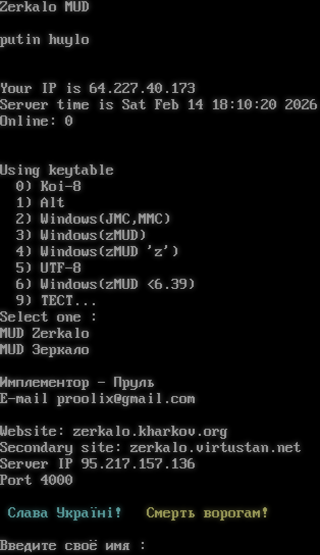 Zerkalo MUD putin huylo Your IP is 64.227.40.173 Server time is Sat Feb 14 18:10:20 2026 Online: 0 Using keytable 0) Koi-8 1) Alt 2) Windows(JMC,MMC) 3) Windows(zMUD) 4) Windows(zMUD 'z') 5) UTF-8 6) Windows(zMUD <6.39) 9) TECT... Select one : MUD Zerkalo MUD Зеркало Имплементор - Пруль E-mail proolix@gmail.com Website: zerkalo.kharkov.org Secondary site: zerkalo.virtustan.net Server IP 95.217.157.136 Port 4000 Слава Україні! Смерть ворогам! Введите своё имя :