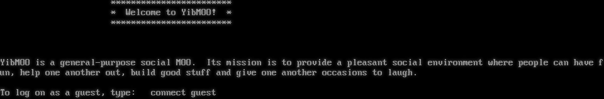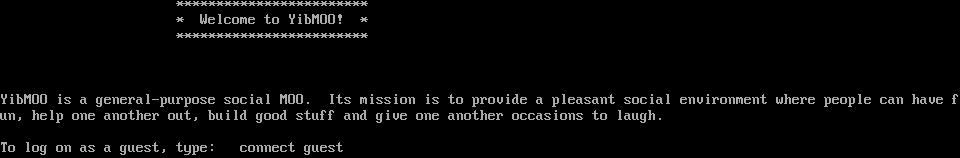 \*\*\*\*\*\*\*\*\*\*\*\*\*\*\*\*\*\*\*\*\*\*\*\* \* Welcome to YibMOO! \* \*\*\*\*\*\*\*\*\*\*\*\*\*\*\*\*\*\*\*\*\*\*\*\* YibMOO is a general-purpose social MOO. Its mission is to provide a pleasant social environment where people can have fun, help one another out, build good stuff and give one another occasions to laugh. To log on as a guest, type: connect guest