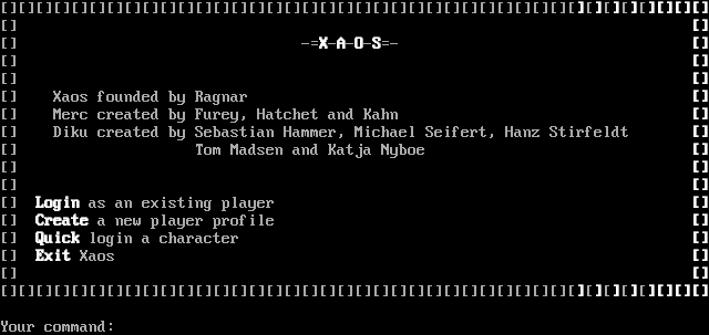 [][][][][][][][][][][][][][][][][][][][][][][][][][][][][][][][][][][][][][][][] [] [] [] -=X-A-O-S=- [] [] [] [] [] [] Xaos founded by Ragnar [] [] Merc created by Furey, Hatchet and Kahn [] [] Diku created by Sebastian Hammer, Michael Seifert, Hanz Stirfeldt [] [] Tom Madsen and Katja Nyboe [] [] [] [] [] [] Login as an existing player [] [] Create a new player profile [] [] Quick login a character [] [] Exit Xaos [] [] [] [][][][][][][][][][][][][][][][][][][][][][][][][][][][][][][][][][][][][][][][] Your command: