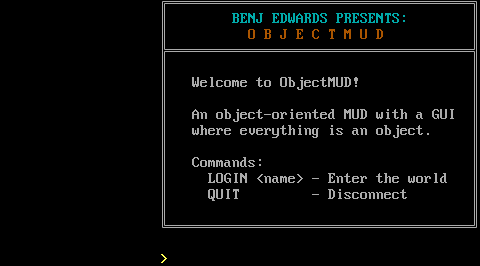 ╔══════════════════════════════════════╗ ║ BENJ EDWARDS PRESENTS: ║ ║ O B J E C T M U D ║ ╠══════════════════════════════════════╣ ║ ║ ║ Welcome to ObjectMUD! ║ ║ ║ ║ An object-oriented MUD with a GUI ║ ║ where everything is an object. ║ ║ ║ ║ Commands: ║ ║ LOGIN <name> - Enter the world ║ ║ QUIT - Disconnect ║ ║ ║ ╚══════════════════════════════════════╝ >
