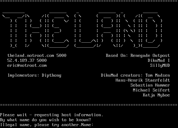 =​======================================================================= _​________ _​______ _ _​______ _ _​_____ \\__ __/\|\\ /\|( _​___ \\ ( \\ ( ___ )( ( /\|( __ \\ ) ( \| ) ( \|\| ( \\/ \| ( \| ( ) \|\| \\ ( \|\| ( \\ ) \| \| \| (___) \|\| (__ \| \| \| (___) \|\| \\ \| \|\| \| ) \| \| \| \| ___ \|\| __) \| \| \| ___ \|\| (\\ \\) \|\| \| \| \| \| \| \| ( ) \|\| ( \| \| \| ( ) \|\| \| \\ \|\| \| ) \| \| \| \| ) ( \|\| (_​___/\\ \| (_​___/\\\| ) ( \|\| ) \\ \|\| (__/ ) )_( \|/ \\\|(_​______/ (_​______/\|/ \\\|\|/ )_)(_​_____/ theland.notroot.com 5000 Based On: Renegade Outpost 52.4.189.37 5000 DikuMud I eric@notroot.com SillyMUD Implementors: Dipthong DikuMud creators: Tom Madsen Hans-Henrik Staerfeldt Sebastian Hammer Michael Seifert Katja Nyboe =​======================================================================= Please wait - requesting host information. By what name do you wish to be known? Illegal name, please try another.Name: