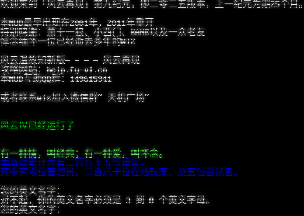 欢迎来到「风云再现」第九纪元,即二零二五版本,上一纪元为期25个月。 本MUD最早出现在2001年,2011年重开 特别鸣谢:萧十一狼、小西门、KANE以及一众老友 悼念缅怀一位已经逝去多年的WIZ 风云温故知新版————风云再现 攻略网站:help.fy-vi.cn 本MUD互助QQ群:149615941 或者联系wiz加入微信群“天机广场” 风云Ⅳ已经运行了六十七天九小时三十七分四秒。 有一种情,叫经典;有一种爱,叫怀念。 本游戏累计共有二百八十五位玩家。 其中有零位管理员、二百八十位在线玩家、及五位尝试者。 您的英文名字: 对不起,你的英文名字必须是 3 到 8 个英文字母。 您的英文名字: