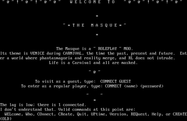 ~ @ ~ ! ~ @ ~ ! ~ @ ~ @ ~ W E L C O M E T O ~ @ ~ @ ~ ! ~ @ ~ ! ~ @ ~ \* ~ \* T H E M A S Q U E \* ~ \* The Masque is a ~ ROLEPLAY ~ MOO. Its theme is VENICE during CARNIVAL, the time the past, present and future. Enter a world where phantasmagoria and reality merge, and RL does not intrude. Life is a Carnival and all are masked. ~ @ ~ To visit as a guest, type: CONNECT GUEST To enter as a regular player, type: CONNECT <name> <password> ~ ~ \* The lag is low; there is 1 connected. I don't understand that. Valid commands at this point are: WELcome, Who, COnnect, CReate, Quit, UPtime, Version, REQuest, Help, or CREATE(OLD)
