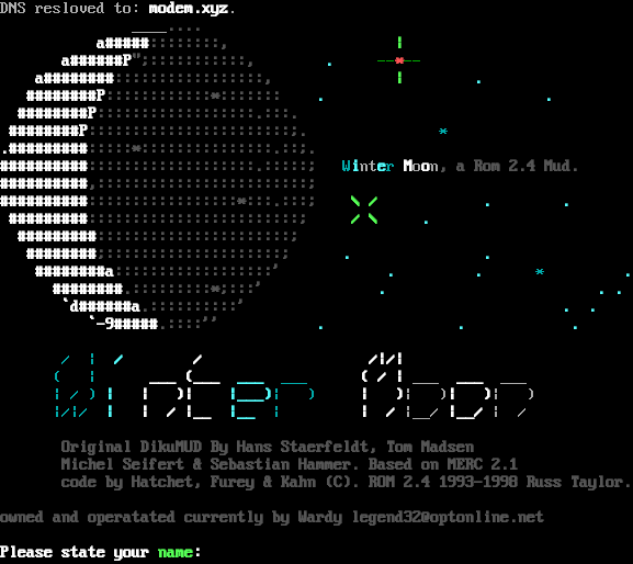 DNS resloved to: modem.xyz. _​___.... a#​####::::::::, \| a#​#####P";:::::::::::, . --\*-- a#​#######:::::::::::::::::, \| . #​#######P::::::::::::\*::::::: . . #​#######P::::::::::::::::::.:::. #​#######P:::::::::::::::::::::::;. \* .​#########:::::\*:::::::::::::::.::;. #​#########:::::::::::::::::::.:::::; Winter Moon, a Rom 2.4 Mud. #​#########,::::::::::::::::::::::::; #​#########:::::::::::::::::\*:::.:::; \\ / . . #​########::::::::::::::::::::::::; / \\ . #​########::::::::::::::::::::::; #​#######;::::::::::::::::::::; . . #​#######a::::::::::::::::::' . . \* . #​#######.:::::::::\*;:::' . . . \`d#​#####a.::::::::::' . . \`-9#​####.::::'' . . . / \| / / /\|/\| ( \| ___ (___ ___ ___ ( / \| ___ ___ ___ \| / ) \| \| )\| \|___)\| ) \| )\| )\| )\| ) \|/\|/ \| \| / \|__ \|__ \| \| / \|__/ \|__/ \| / Original DikuMUD By Hans Staerfeldt, Tom Madsen Michel Seifert & Sebastian Hammer. Based on MERC 2.1 code by Hatchet, Furey & Kahn (C). ROM 2.4 1993-1998 Russ Taylor. owned and operatated currently by Wardy legend32@optonline.net Please state your name: <!-- Set up MXP elements --><!ELEMENT Im "<send href='immnote' hint='Read your new immnote.'>" ATT='immnote'><!ELEMENT Nn "<send href='note' hint='Read your new note.'>" ATT='note'><!ELEMENT Id "<send href='idea' hint='Read your new idea.'>" ATT='idea'><!ELEMENT Mi "<send href='miscellaneous' hint='Read your misc note.'>" ATT='miscellaneous'><!ELEMENT Cr "<send href='crash' hint='Read your new crash.'>" ATT='crash'><!ELEMENT Ad "<send href='addition' hint='Read your new addition.'>" ATT='addition'><!ELEMENT Gn "<send href='gnote' hint='Read your new guild note.'>" ATT='gnote'><!ELEMENT Gn "<send href='rpnote' hint='Read your new role-play note.'>" ATT='rpnote'><!ELEMENT Pn "<send href='penalty' hint='Read your new penalty.'>" ATT='penalty'><!ELEMENT Ne "<send href='news' hint='Read your new news article.'>" ATT='news'><!ELEMENT Ch "<send href='change' hint='Read your new change.'>" ATT='change'><!ELEMENT Ex "<send href='&dir;' hint='Go &dir;.'>" ATT='dir'><!ELEMENT clan "<send href='mxpmenudefault 1\|gstat &player;\|roster &player;' hint='Right click for menu\|---Clan Menu---\|Gstat &player;\|Roster &player;'>" ATT='player'><!ELEMENT jail "<send href='mxpmenudefault 1\|bail &player;\|jailinfo &player;' hint='Right click for menu\|---Player Menu---\|bail &player;\|jailinfo &player;'>" ATT='player'><!ELEMENT pfk "<send href='mxpmenudefault 1\|pkstat &player;\|finger &player;' hint='Right click for menu\|---Player Menu---\|Pkstat &player;\|Finger &player;'>" ATT='player'><!ELEMENT impfk "<send href='mxpmenudefault 1\|mxpmenudefault 2\|pkstat &player;\|finger &player;\|mxpmenudefault 2\|stat char &player;\|transfer &player;\|transfer &player; original\|jail &player;\|parole &player;' hint='Right click for menu\|---Player Menu---\|---Mortal Commands---\|Pkstat &player;\|Finger &player;\|-​---Imm Commands-​---\|Stat &player;\|Transfer &player; to your location\|Transfer &player; to original location\|Jail &player;Parole &player;\|'>" ATT='player'><!ELEMENT ippfk "<send href='mxpmenudefault 1\|mxpmenudefault 2\|pkstat &player;\|finger &player;\|mxpmenudefault 2\|stat char &player;\|transfer &player;\|transfer &player; original\|jail &player;\|parole &player;\|disconnect &player;\|freeze &player;\|purge &player;' hint=' Right click for menu\|---Player Menu---\|---Mortal Commands---\|Pkstat &player;\|Finger &player;\|-​---Imm Commands-​---\|Stat &player;\|Transfer &player; to your location\|Transfer &player; to original location\|Jail &player;\|Parole &player;\|Disconnect &player;\|Freeze &player;\|Purge &player;'>" ATT='player'> Illegal name, try another. (Either a mob has the name, we banned it, its ALL CAPS, or has numbers in it!) Name:
