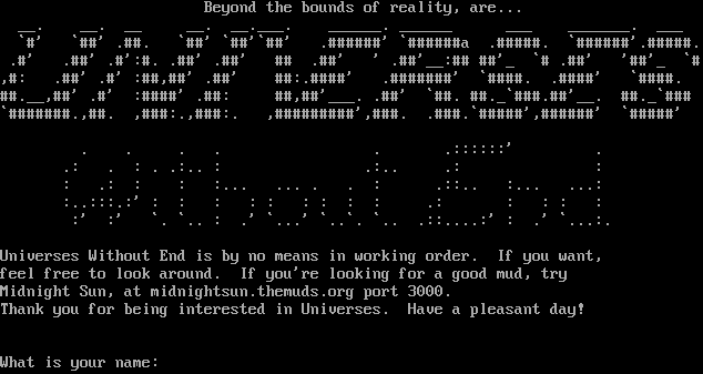 Beyond the bounds of reality, are... __. __. __ __. _​_.___. _​_____. _​_____ ___ _​______. ___ \`#' \`##' .​##. \`##' \`##'\`##' .​######' \`#​#####a .​#####. \`#​#####'.​#####. .#' .##' .#':#. .##' .##' ## .##' ' .##'__:## ##'_ \`# .##' '##'_ \`# ,#: .##' .#' :##,##' .##' ##:.​####' .​#######' \`#​###. .​####' \`#​###. #​#.__,##' .#' :#​###' .##: ##,##'_​__. .##' \`##. #​#._\`#​##.##'__. #​#._\`### \`#​######.,##. ,###:.,###:. ,#​########',#​##. .​###.\`#​####',#​#####' \`#​####' . . . . . .::::::' . .: . : . .:.. : .:.. .: : : .: : : :... ... . . : .::.. :... ...: :..:::.:' : : : : : : : : : .: : : : : :' :' \`. \`.. : .' \`...' \`..\`. \`.. .::.​...:' : .' \`...:. Universes Without End is by no means in working order. If you want, feel free to look around. If you're looking for a good mud, try Midnight Sun, at midnightsun.themuds.org port 3000. Thank you for being interested in Universes. Have a pleasant day! What is your name: